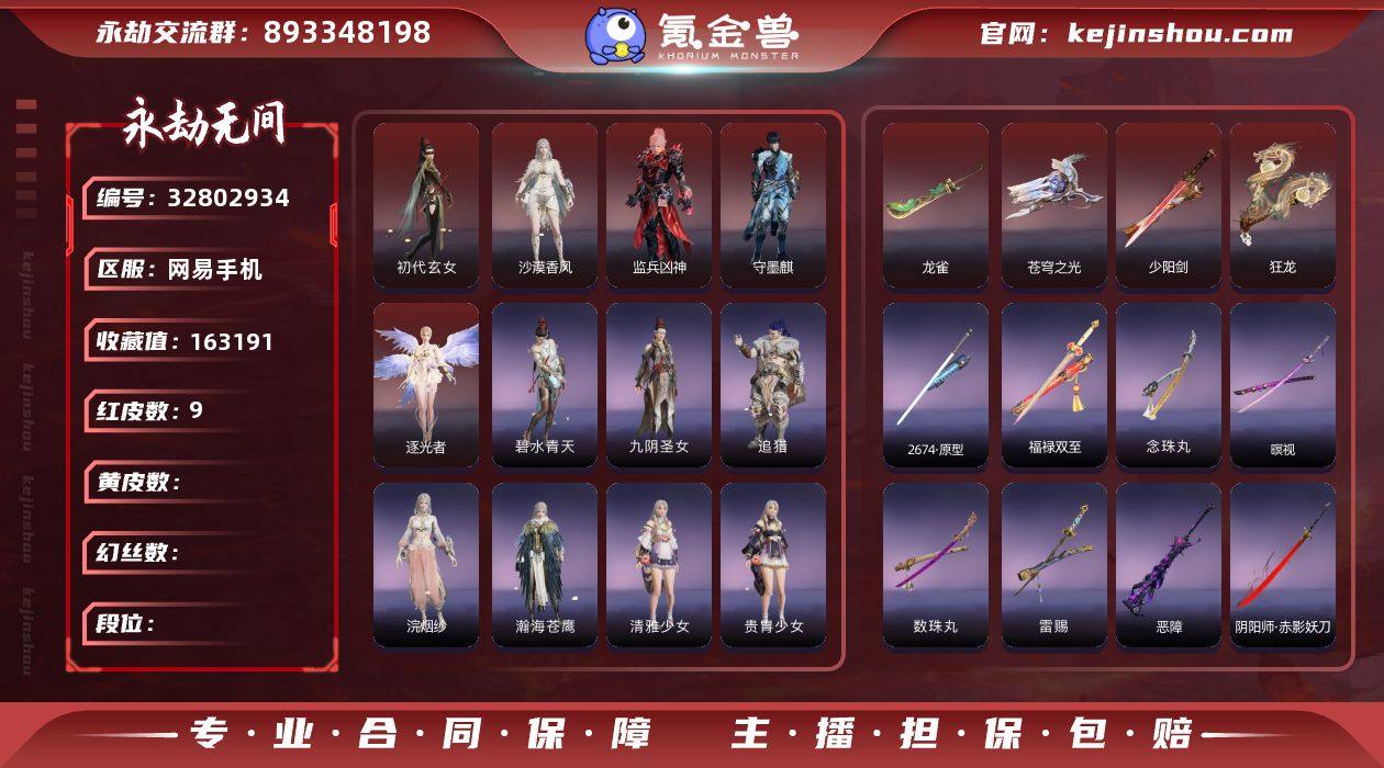 YJJ2086/4.27换绑/等级211/s19三人黄金5/9红246金收藏值163191/9红色神品:/初代玄女/沙漠香风/监兵凶神/守墨麒/逐光者/少阳剑/龙雀/狂龙/苍穹之光/宁红夜:/初代玄女/倒反阴阳炽羽/九阴圣女/碧水青天/泠川发 沈妙:/奥村春NOIR/腓腓/NOIR发型 天海:/觉明尊者/八宝龙王 殷紫萍:/鹅黄纱梦/风雨谐/瑶光沐月/暖绒发 特木尔:/红蓝狂想/追猎 季沧海:/鹧鸪天/江海发/白狼发 胡桃:/遣唐使/贵胄少女/承云兰寿/清雅少女/木棉发 崔三娘:/阿娜希塔/怒浪 岳山:/铁面/杨戬/觅封侯发/玄鳞发 无尘:/雨宫莲JOKER/申公豹/未济袍 顾清寒:/禄运玉霄/绯霜发 武田信中:/烈武者 迦南:/沙漠香风/蕾雅/浣烟纱/瀚海苍鹰 胡为:/监兵凶神/福瑞天泽 季莹莹:/炽火照夜/高卷杏PANTHER/宵烛发/雾灼发 玉玲珑:/丽娘/春不敛/惊雀发 哈迪:/狮鬓发/秀逸发 魏轻:/念奴娇/豪杰发 张起灵:/守墨麒/古冢行/云间影 席拉:/逐光者/雪铃绮歌/天虹咏/协光/蜜语发 蓝梦:/如梦令/牵云霞发/沉醉发 拳刃:/无相印 长剑:/少阳剑/冰魄剑/福禄双至/2674原型 太刀:/切影/念珠丸/数珠丸/暝视/残阳/雷赐 横刀:/尽春锋/雷厉 阔刀:/龙雀/恶障/赤影妖刀 斩马刀:/三尖两刃刀/护云狩/断月影/璃光星辉环月 枪:/光威之矛/建木/灵木角/镇山河/长虹...