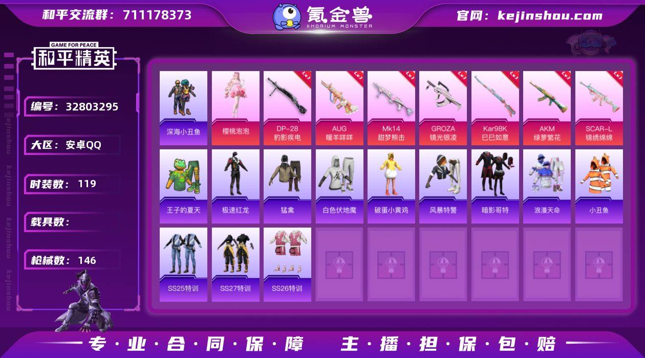 2粉装 9粉枪 119套装 146枪皮 17热门 超能勇士 吉莉礼服 阳光火鸡 白熊同盟 黄色名流 猛禽 破晓战魂 耀粉歌者 潮流炫酷 王牌教练 龟仙人 明鸳圣池 冷焰舞者 空岛之星 惊鸿侠骨 竞技名士 锦衣飞扬 深蓝色名流 酒红色名流 灼焰舞者 龙的传人 森林游猎者 湖蓝色名流 绯格组合 青春校园 完美偶像 蓝彩潮人 绮丽涂鸦 旭日情侣 血色贵族 缤纷果语 Alan Walker 麻辣教官 人气偶像 幻影武者 都市魅力 热血青春 角色-樱桃泡泡 GROZA-影袭 SCAR-L-黄金龙骨 Mini14-耀粉歌者 汤姆逊-炫彩节奏 M416-红色方程式 AUG-耀粉歌者 S12K-玩趣呆呆 M24-影袭 M249-糯团青竹 AC-VAL-天降萌叽 蜜獾-天降萌叽 MG3-惊鸿侠骨 AUG-天降萌叽 SCAR-L-锦绣绵绵(5级) AMR-妙红点点 AMR-乌木金纹 S12K-夜灯 M200-惊鸿侠骨 UZI-啾咪啾咪 UMP45-夜灯 爆炸猎弓-惊鸿侠骨 M416-绯红前夜 M417-惊鸿侠骨 MP5K-乌木金纹 UZI-天降萌叽 UMP45-生命誓言 AKM-破晓战魂 Vector-生命誓言 SCAR-L-夜灯 汤姆逊-天降萌叽 SKS-炫彩节奏 AKM-龙的传人 Vector-彩虹符号 P90-乌木金纹 M16A4-幻世战舞者 AKM-绿萝繁花(5级) Kar98K-巳巳如意(5级) Mk14-甜梦熊击(5级) AUG-暖羊咩咩(5级) GROZA-镜光银凌(5级) DP-28-豹影疾电(5级) 深...