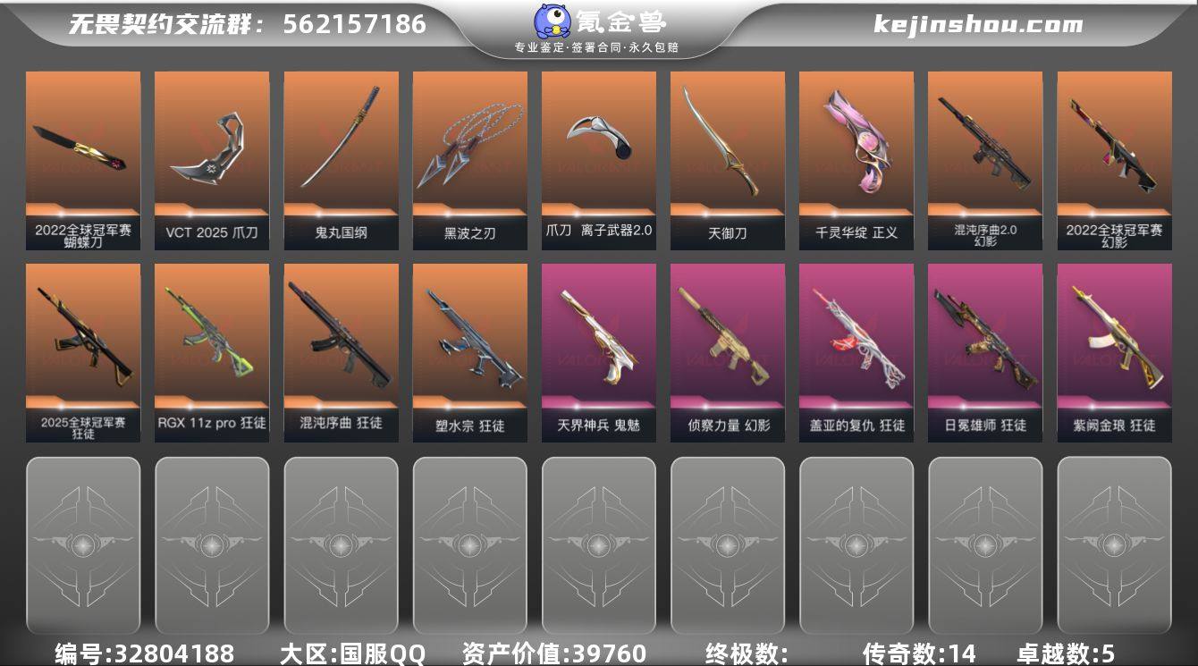 【限定】: 2025全球冠军赛 狂徒, 2022全球冠军赛 幻影, 2022全球冠军赛 蝴蝶刀, VCT 2025 爪刀 【近战】: 天御刀, 鬼丸国纲, 黑波之刃, 2022全球冠军赛 蝴蝶刀, 离子武器//2.0 爪刀, VCT 2025 爪刀 【狂徒】: 混沌序曲 狂徒, 日冕雄师 狂徒, 2025全球冠军赛 狂徒, RGX 11z Pro 狂徒, 塑水宗 狂徒, 盖亚的复仇 狂徒, 紫阙金琅 狂徒 【幻影】: 混沌序曲//2.0 幻影, 2022全球冠军赛 幻影, 侦察力量 幻影 【正义】: 千灵华绽 正义 【鬼魅】: 天界神兵 鬼魅