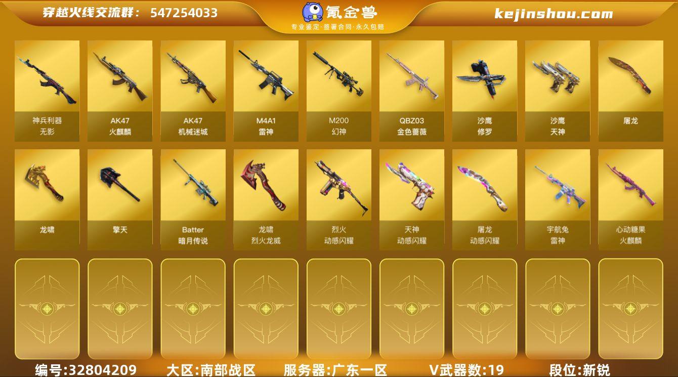 【ky6390】广东一区-19V-0王者武器数-0炫金武器数 【热门武器】:QBZ03-金色蔷薇,M200-幻神,死亡之眼*2,金色蔷薇-空,沙鹰-修罗*3 【音效卡】:屠龙-动感闪耀 音效卡 【皮肤】:雷神-宇航兔皮肤,火麒麟-心动糖果 【角色】:乔伊教练,暗夜-X,嘉年华灵狐,灵动武士,曼陀罗-X,曼陀罗-礼服,潘多拉-X,斯沃特-X 【人偶武器】:金色蔷薇-空,AWM-灵狐-15周年嘉年华,COP-旗袍 【暴走生化】:死亡之眼*2 【挑战大师】:AK47-冰龙粉碎者 【英雄级武器】:AK47-火麒麟,M4A1-雷神,AK47-机械迷城,无影-神兵利器,QBZ03-金色蔷薇,烈火-动感闪耀,M200-幻神,Barrett-暗月传说,沙鹰-修罗*3,沙鹰-天神,天神-动感闪耀,屠龙,龙啸,擎天,屠龙-动感闪耀,龙啸-烈火龙威,手雷-动感闪耀 【源级武器】:源·火麒麟,源·雷神*2,魂·雷神-维纳斯,魂·雷神-15周年嘉年华,御·雷神-烈虎,魂·黑骑士-现代金属,魂·黑骑士-幻能朋克,魂·黑骑士-破浪10年,源·AK47-黑武士,源·超新星,源·机械迷城,魂·龙血-锋芒破茧,魂·QBZ03-金色蔷薇-萌杀,源·天龙*2,源·毁灭,御·毁灭-黑大圣,源·Barrett-朱雀,魂·炼狱-玩具枪,御·炼狱-女娲,魂·修罗-15周年嘉年华,源·天神,魂·屠龙-都是Cfer,...