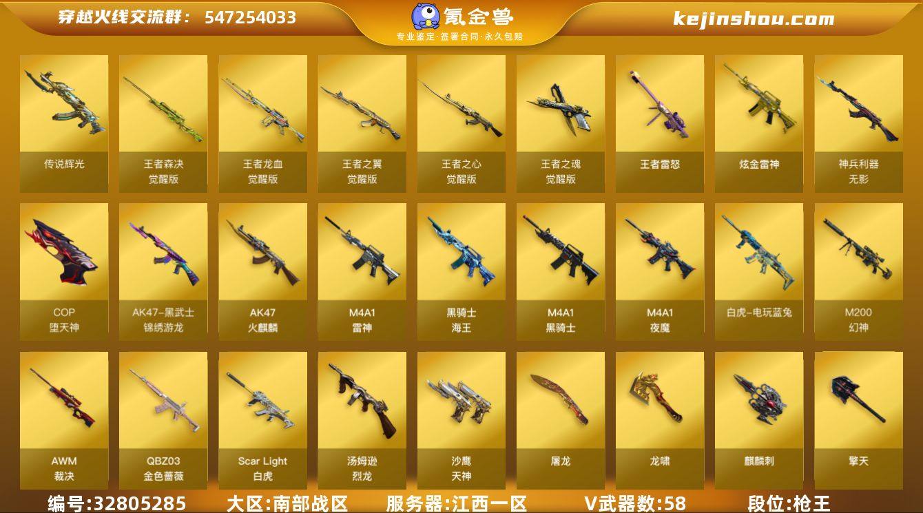 【ky6431】江西一区-69V-16王者武器数-1炫金武器数 【传说武器】:传说辉光 【热门武器】:传说辉光,QBZ03-金色蔷薇,Scar Light-白虎,M200-幻神,金色蔷薇-古蛇迷踪,修罗-古蛇迷踪,M200-竞技荣光,白虎-电玩蓝兔,柯尔特-冠军之特,Cat-刀锋,M4A1-黑骑士,汤姆逊-烈龙,金色蔷薇-空,COP-堕天神,Knife-冠军之刃 【王者炫金武器】:王者雷怒,高爆手雷-雷霆王者*4,烟雾弹-雷霆王者,炫金雷神 【音效卡】:M4A1-黑骑士音效卡,Barrett-极光音效卡,Scar Light-白虎音效卡 【皮肤】:M200-幻神-黄忠皮肤,幻神-宠儿-2021MVP,白虎-电玩粉兔皮肤,白虎-白鲨-CFPLS23冠军,QBZ03-AG-CFPLS19冠军,QBZ03-巅峰荣耀皮肤,裁决-巅峰荣耀 皮肤,雷神-荣耀之魄,雷神-宠儿-2019MVP,雷神-烈虎皮肤,雷神-脉冲核心,雷神-源计划2.0专属 皮肤,火麒麟-冠军之心,火麒麟-平天大圣,火麒麟-白虎,火麒麟-心动糖果,毁灭-冠军之怒,M4A1-千变-孔明皮肤,黑骑士-冠军之势,黑骑士-破界 皮肤,战神-粉色甜心皮肤,战神-紫绶金章皮肤,战神-流金岁月皮肤,AK47-B-常胜将军-曹操,屠龙-荣耀之锋,龙啸-蛇姬 皮肤,擎天-冠军之击 【角色】:葵,凌霄,晴雅,王者玲珑,王者玲珑-小乔,蛇隐...