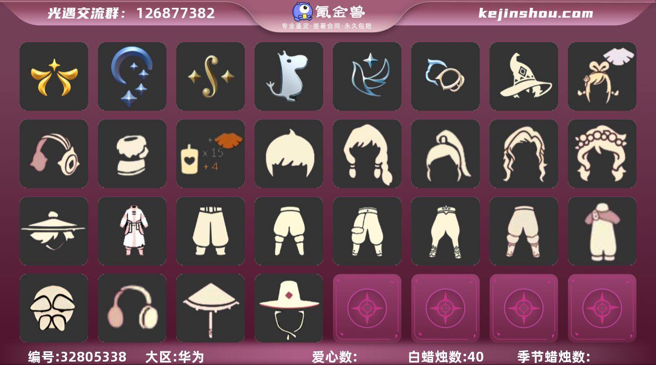 "6季武士裤欧若拉巫师绊爱蛛网音韵吉他雪人鞋祥云裤皮皮猫 编号:YXB13188 区服:华为 翼数量:146季卡数:10 资源:蜡烛40 爱心9 红蜡0 已毕业地图:晨岛 雨林 霞谷 毕业季节: 欧若拉季 夜行季 二重奏季 姆明季 青鸟季 双星季 热门礼包: 雪人暖靴 祥云服饰 巫师帽 玉兔 彩虹耳机 圣诞鹿角 蛛网斗篷 白雪斗篷 绊爱套装 青衫落拓套装 创始人 皮皮猫 音韵吉他 热门复刻:背带裤 白棉裤 毛靴棉裤 搓澡巾 灯笼裤 紧身棉裤 连体衣 武士裤 过膝长袍 鼬鼠面具 老爷爷面具 粗辫 书虫 总裁头 正太 高马尾 明制帽 箬笠 花环 虚荣 军帽 爱神 樱花头 单片羽毛 黄色蝴蝶结 花环发饰 红耳机 飘带耳坠 烟火耳坠 黑金斗 白金斗 蔚紫斗 道袍 小浣熊斗 树精斗 绿芽斗 暗彩斗 雨伞 星星灯",透明蝶翼斗