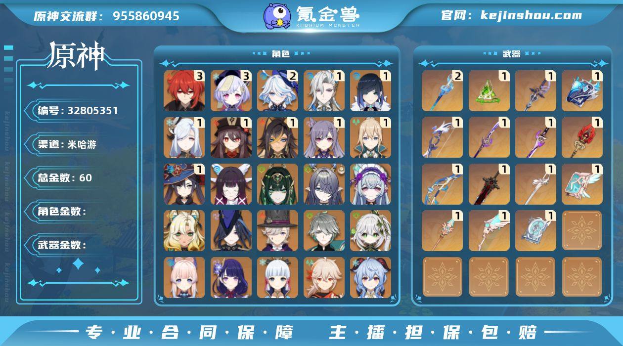 【原神】冒险等级:60,五星数量:43,五星角色:迪卢克 * 3命,七七 * 3命,芙宁娜 * 2命,迪希雅 * 1命,那维莱特 * 1命,胡桃 * 1命,刻晴 * 1命,莫娜 * 1命,琴 * 1命,申鹤 * 1命,夜兰 * 1命,珊瑚宫心海,希诺宁,神里绫华,温迪,钟离,梦见月瑞希,林尼,提纳里,纳西妲,菈乌玛,艾尔海森,奈芙尔,哥伦比娅,枫原万叶,甘雨,克洛琳德,雷电将军__五星武器:静水流涌之辉 * 2精,万世流涌大典,真语秘匣,风鹰剑,护摩之杖,狼的末路,四风原典,天空之脊,天空之卷,天空之翼,雾切之回光,薙草之稻光,终末嗟叹之诗,若水,赦罪__四星角色:行秋 * 6命,久岐忍 * 6命,珐露珊 * 6命,凝光 * 6命,迪奥娜 * 6命,砂糖 * 6命,瑶瑶 * 6命,米卡 * 6命,多莉 * 6命,柯莱 * 6命,早柚 * 6命,烟绯 * 6命,重云 * 6命,辛焱 * 6命,诺艾尔 * 6命,罗莎莉亚 * 6命,菲谢尔 * 6命,北斗 * 6命,夏洛蒂 * 6命,香菱 * 5命,芭芭拉 * 5命,云堇 * 5命,赛索斯 * 5命,班尼特 * 4命,坎蒂丝 * 4命,五郎 * 4命,雷泽 * 4命,卡齐娜 * 3命,九条裟罗 * 3命,鹿野院平藏 * 3命,托马 * 3命,嘉明 * 3命,卡维 * 2命,蓝砚 * 2命,菲米尼 * 1命,琳妮特 * 1命,夏沃蕾 * 1命,伊法 * 1命,爱诺 * 1命,莱依拉,欧洛伦,塔利雅