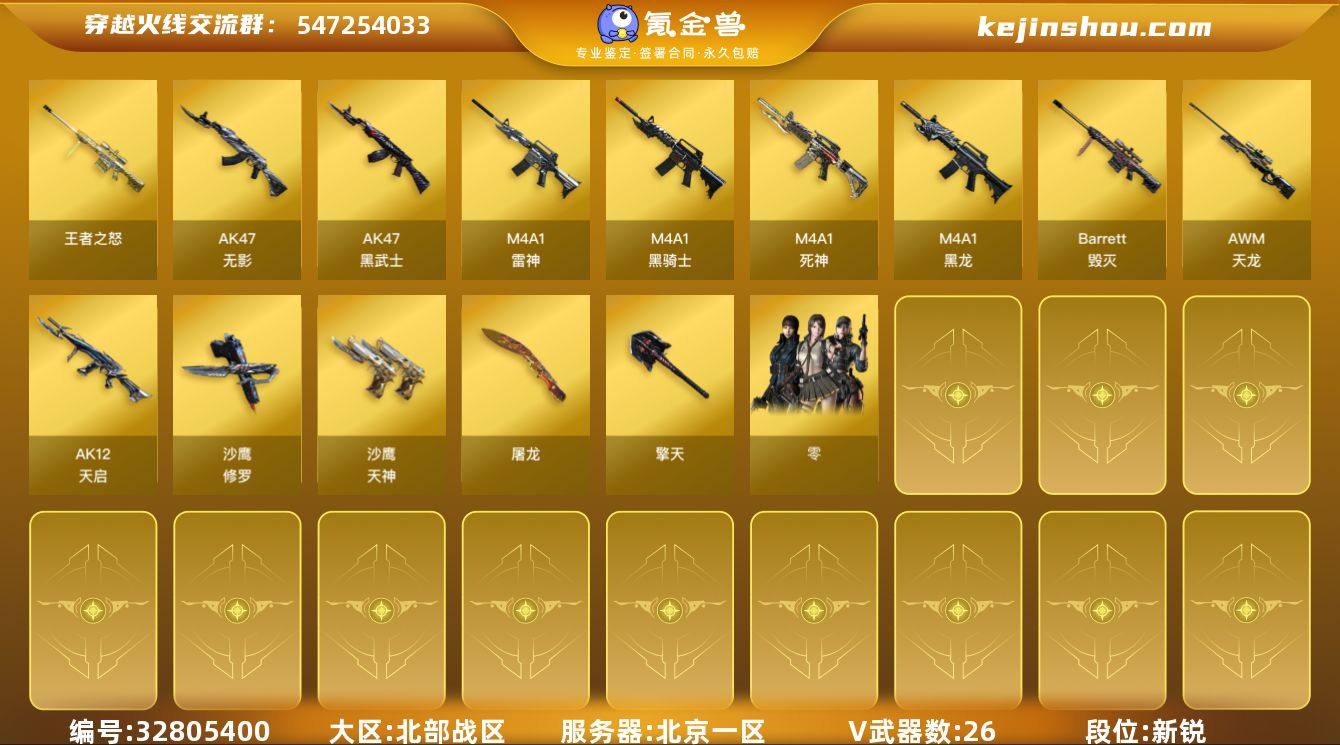 【ky4860】北京一区-27V-1王者-0炫金 【热门武器】:M4A1-黑骑士,沙鹰-修罗*2 【王者炫金武器】:王者之怒 【角色】:零 【英雄级武器】:M4A1-黑龙,M4A1-雷神,M4A1-黑骑士,AK47-无影,M4A1-死神,AK47-黑武士,AK12-天启,AWM-天龙,Barrett-毁灭,沙鹰-修罗*2,沙鹰-天神*2,屠龙*5,擎天,高爆手雷-雷霆*2,闪光弹-雷霆*2,烟雾弹-雷霆*2 【道具】:夺命之镰,防化服,防弹头盔,防弹衣,C4工具钳,手雷包 【特殊枪械】:1黑骑士