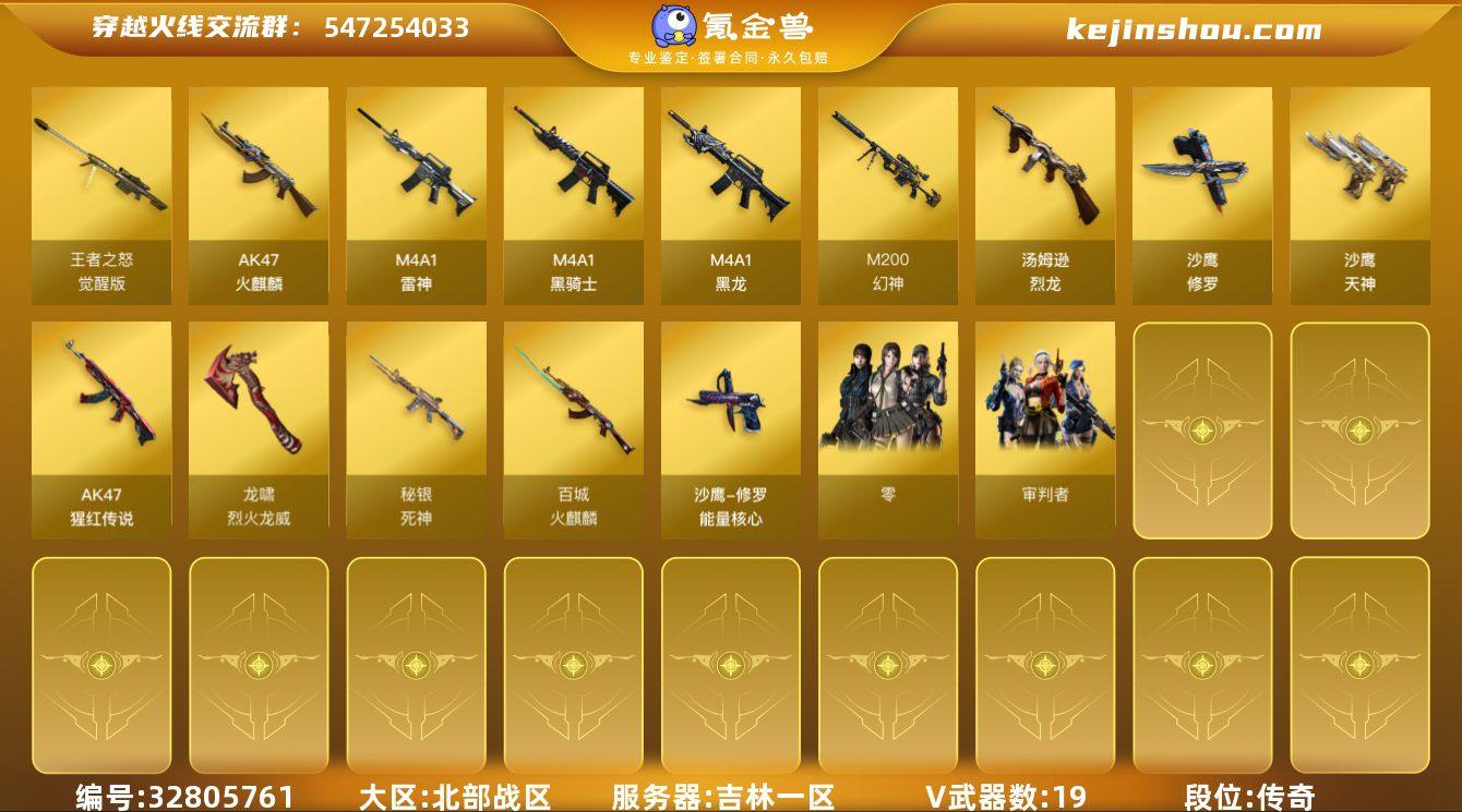 【ky6409】吉林一区-23V-1王者武器数-0炫金武器数 【热门武器】:M200-幻神,M4A1-黑骑士,汤姆逊-烈龙,沙鹰-修罗 【皮肤】:火麒麟-百城,死神-秘银,修罗-能量核心 【角色】:零,审判者,电竞少女,风暴女,娟娟,灵狐者-黄金海岸,麻雀,潘多拉-X,潘多拉-甜心教官,潜龙队-X,铁骑荣耀,兔囡囡 【人偶武器】:迷你生化手雷 【暴走生化】:超级对讲机 【挑战大师】:激光毁灭者III 【英雄级武器】:AK47-火麒麟,M4A1-黑龙,M4A1-雷神*2,M4A1-黑骑士,AK-47-猩红传说,M200-幻神,王者之怒-觉醒版,汤姆逊-烈龙,沙鹰-修罗,沙鹰-天神,龙啸-烈火龙威,高爆手雷-竞技荣光*3,闪光弹-竞技荣光*2,烟雾弹-幻灵,烟雾弹-竞技荣光*2,M4A1-赤狱骑士 【源级武器】:魂·火麒麟-百城,源·雷神,魂·雷神-新春神龙,魂·雷神-萌柴,御·雷神-烈虎,魂·黑骑士-破浪10年*2,御·黑骑士-冰魄,源·机械迷城,M4A1-青龙-掌上穿越火线,源-金色蔷薇,金色蔷薇-狼王,源·天龙,魂·裁决-凤灵*2,魂·毁灭-青帝*2,魂·Barrett-朱雀-锦鲤,源·Barrett-朱雀,魂·屠龙-惊鸿,魂·擎天-破浪10年,源·龙啸*2,魂·麒麟刺-神秘黑洞 【道具】:CFS限定背包,哔哩哔哩名片,绿色巨人,灵魂忍者,迷雾幽灵...