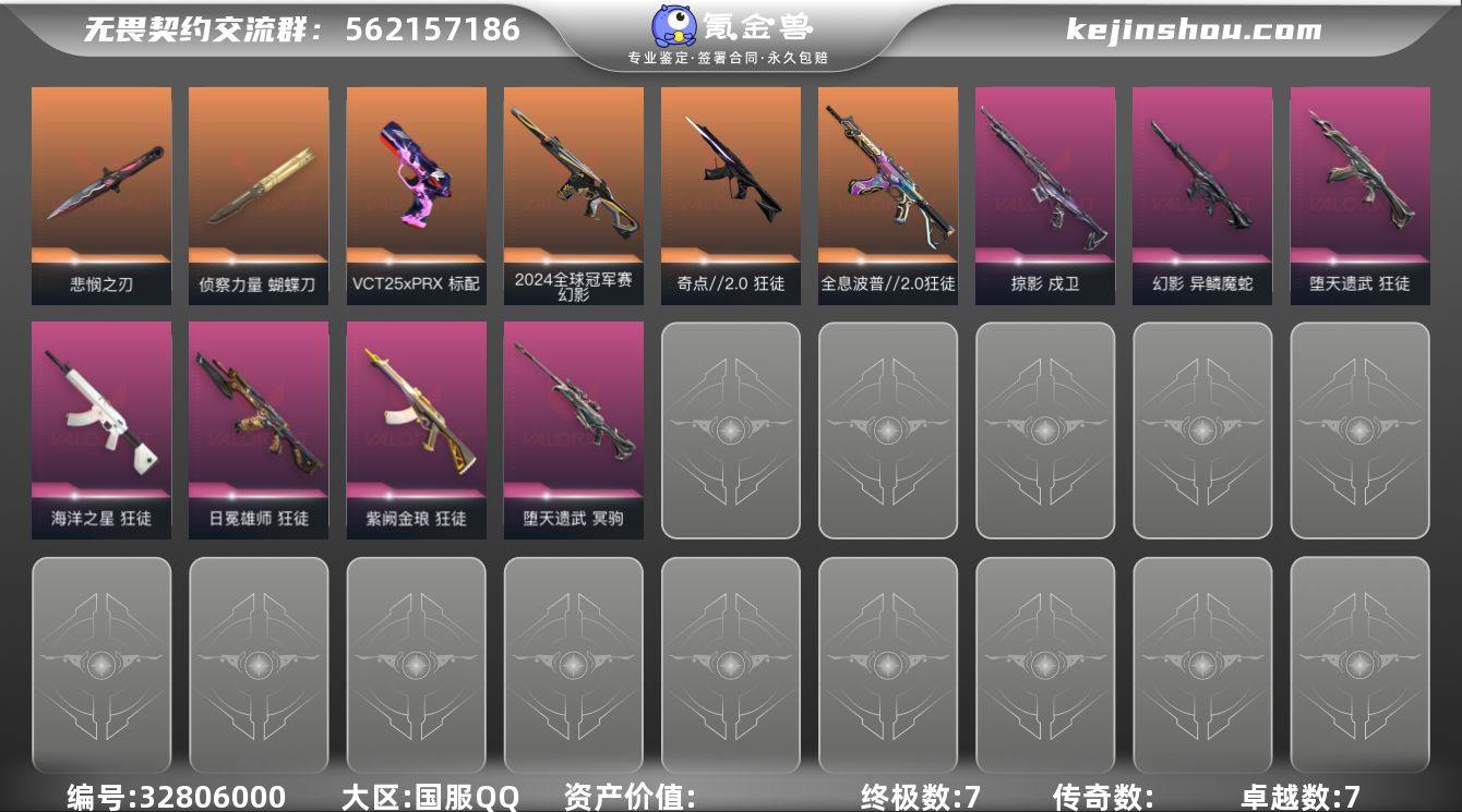 【qyz9736】包人脸 玩够能回血 3刀6狂徒 24幻影 qyz9736 【近战武器】:近战武器-无畏契约季前邀请赛 悲悯之刃,近战武器-侦察力量 蝴蝶刀,近战武器-剥皮小刀 【狂徒】:狂徒-奇点//2.0,狂徒-全息波普//2.0,狂徒-堕天遗武,狂徒-海洋之星,狂徒-日冕雄师,狂徒-紫阙金琅 【幻影】:幻影-2024全球冠军赛,幻影-异鳞魔蛇 【戍卫】:戍卫-掠影 【冥驹】:冥驹-堕天遗武 【VCT手枪】:标配-VCT25 x PRX 【正义】:正义-超限闪存,正义-纳米打击 【鬼魅】:鬼魅-诡秘蛇影,鬼魅-星云暗涌 【卡面】:终章:激斗汉堡 卡面,进入射程 卡面,《双城之战》拥抱 卡面,精灵大战 卡面,欢迎来到底城 卡面,南瓜盛典 卡面,修车达人 卡面,正义的化身 卡面,时间到 卡面,最高舞台 卡面,声感陷阱设计图 卡面,梦幻奶茶 卡面,零点嗅探设计图 卡面,夜班 卡面,无畏契约GO!第一卷:芮娜 卡面,无畏契约GO!第一卷:零 卡面,《双城之战》金克丝 卡面,代号红色 卡面,新兵报到 卡面,V契约 卡面,无畏契约 卡面 【喷漆】:嗨宝南瓜灯 喷漆,嘭! 喷漆,都算到了 喷漆,控场勿近 喷漆,小丑猫 喷漆,熊抱 喷漆,超级粉丝 喷漆,捷风差距 喷漆,惊声尖叫 喷漆,拼一枪 喷漆,买装还是...