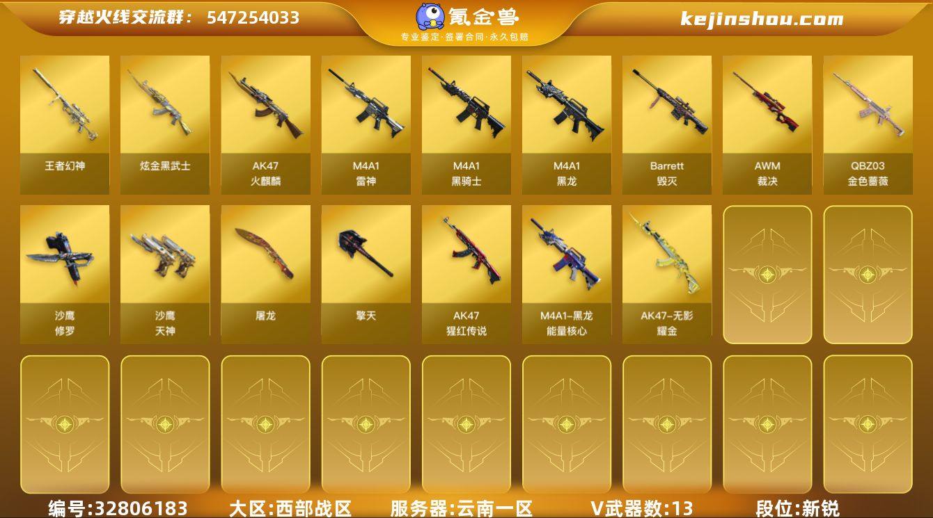 【943866】云南一区-16V-1王者武器数-1炫金武器数 【热门武器】:王者幻神,QBZ03-金色蔷薇,死亡之眼,M4A1-黑骑士,沙鹰-修罗 【王者炫金武器】:王者幻神,炫金武士 【音效卡】:M4A1-黑骑士音效卡 【皮肤】:黑龙-能量核心,无影耀金皮肤 【角色】:云海玲珑,风暴女,嘉年华灵狐,娟娟,潘多拉-X,新娜塔莎 【人偶武器】:AWM-灵狐-15周年嘉年华 【暴走生化】:死亡之眼 【挑战大师】:神圣爆裂者III,AK47-冰龙粉碎者,激光毁灭者III,阐释者III 【英雄级武器】:AK47-火麒麟,M4A1-黑龙,M4A1-雷神,M4A1-黑骑士,QBZ03-金色蔷薇,AK-47-猩红传说,Barrett-毁灭*2,AWM-裁决,沙鹰-修罗,沙鹰-天神,屠龙,擎天 【其他武器】:源-千变,源·火麒麟,源·雷神*2,魂·雷神-15周年嘉年华,源·超新星,源·青龙,源·天龙,加特林-炼狱-掌火,魂·修罗-15周年嘉年华,魂·擎天-蒸汽钟表 【道具】:炫彩背包,绿色巨人,灵魂忍者,迷雾幽灵,夺命之镰,防化服*2,金色流光-枪王排位,防弹头盔*2,防弹衣*2,C4工具钳*3,手雷包*4 【特殊枪械】:1黑骑士