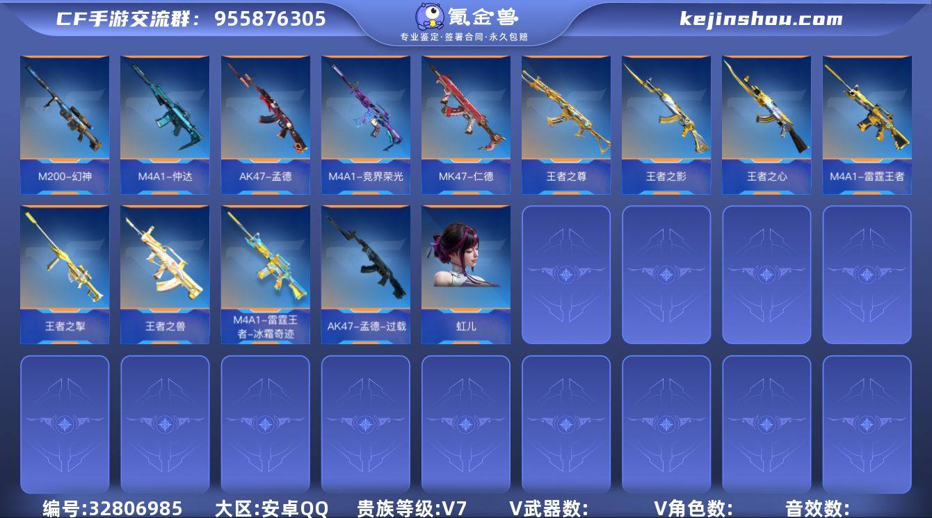 安卓Q\贵族7\虹儿\\M4A1-雷霆王者-冰霜奇迹\AK47-孟德-过载\M4A1-竞界荣光\王者之掣\M200-幻神-瑞财\MK47-仁德\M4A1-仲达\王者之心\王者之影\王者之兽\王者之尊\王者之誉\AN94-盖\王者之狱\王者之迹\COP3\王者之锋\王者之蝶\P90-雷暴王者\M12S-雷霆王者-冰霜奇迹\CZS2-仲康\王者之霆\详情见图