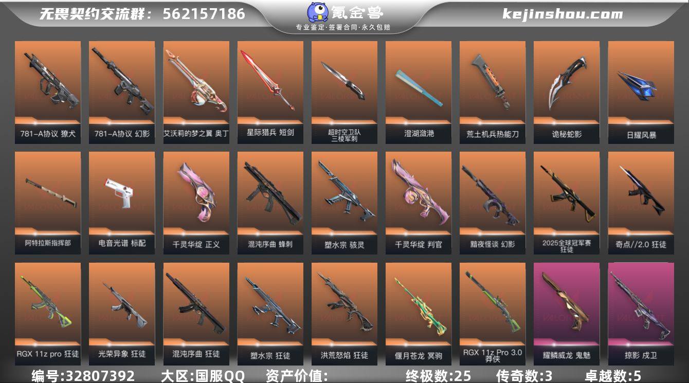 【Bww269】【精品多热门皮成品号】国服Q区 可二次 皮肤价值45810【橙皮25 金皮3 紫皮5 皮肤116 英雄29 卡面134 已用源晶1405】(黑波、三棱、鱼扇、25冠军AK、显卡AK、盖亚AK、侦查幻影、掠夺戍卫、莲花正义) 【英雄】:幻棱,炼狱,维斯,暮蝶,钛狐,壹决,铁臂,捷风,雷兹,幽影,不死鸟,贤者,猎枭,蝰蛇,零,芮娜,奇乐,尚勃勒,霓虹,斯凯,夜露,星礈,K/O,海神,盖可,黑梦,钢锁 【近战武器】:近战武器-碎心裂刃,近战武器-超时空卫队 三棱军刺,近战武器-黑波之刃,近战武器-澄湖潋滟,近战武器-荒土机兵 热能刀,近战武器-诡秘蛇影 军刀,近战武器-日耀风暴 遗器,近战武器-阿特拉斯指挥部 甩棍,近战武器-星际猎兵 短剑 【狂徒】:狂徒-2025全球冠军赛,狂徒-洪荒怒焰,狂徒-混沌序曲,狂徒-奇点//2.0,狂徒-塑水宗,狂徒-RGX 11z Pro,狂徒-光荣异象,狂徒-盖亚的复仇,狂徒-荒土机兵,狂徒-诡秘蛇影 【幻影】:幻影-黯夜怪谈,幻影-781-A协议,幻影-侦察力量,幻影-纳米打击,幻影-末日之翼 【戍卫】:戍卫-掠影,戍卫-逆冲蛮牛,戍卫-折光棱晶 【獠犬】:獠犬-781-A协议,獠犬-逆冲蛮牛 【冥驹】:冥驹-偃月苍龙,冥驹-堕天遗武,冥驹-荒土机兵 【飞将...