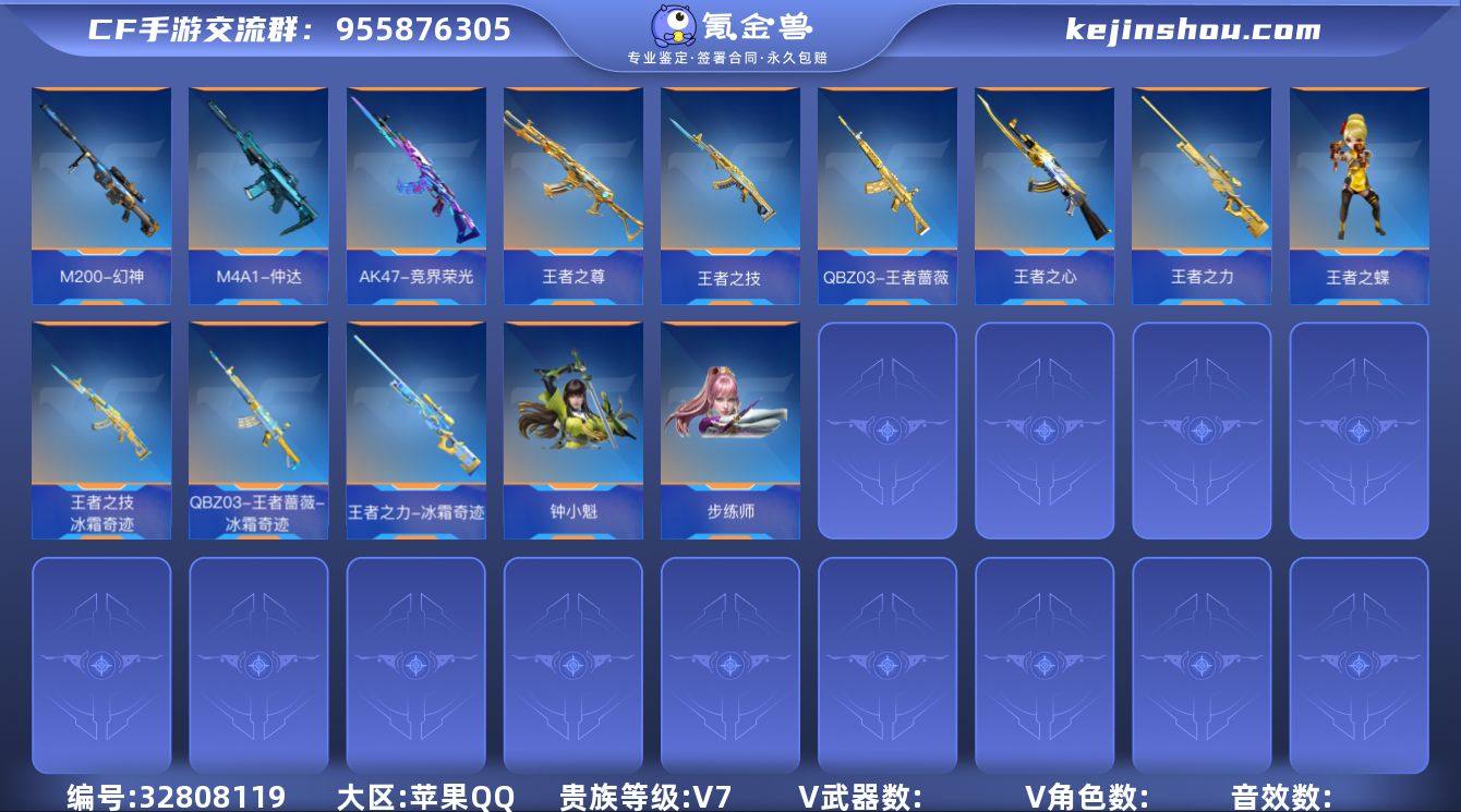 苹果Q☝贵族7☝步练师☝钟小魁☝王者之力-冰霜奇迹☝王者之技-冰霜奇迹☝QBZ03-王者蔷薇-冰奇迹☝M4A1-仲达☝王者之尊☝AK47-竞界荣光☝AN94-盖☝王者之心☝M200-竞技荣光☝GM6-逆骨☝M200-幻神☝王者之蝶☝CZS2-仲康☝王者之霆☝KSG-孟获☝COP 357-雷霆☝详细见图☝