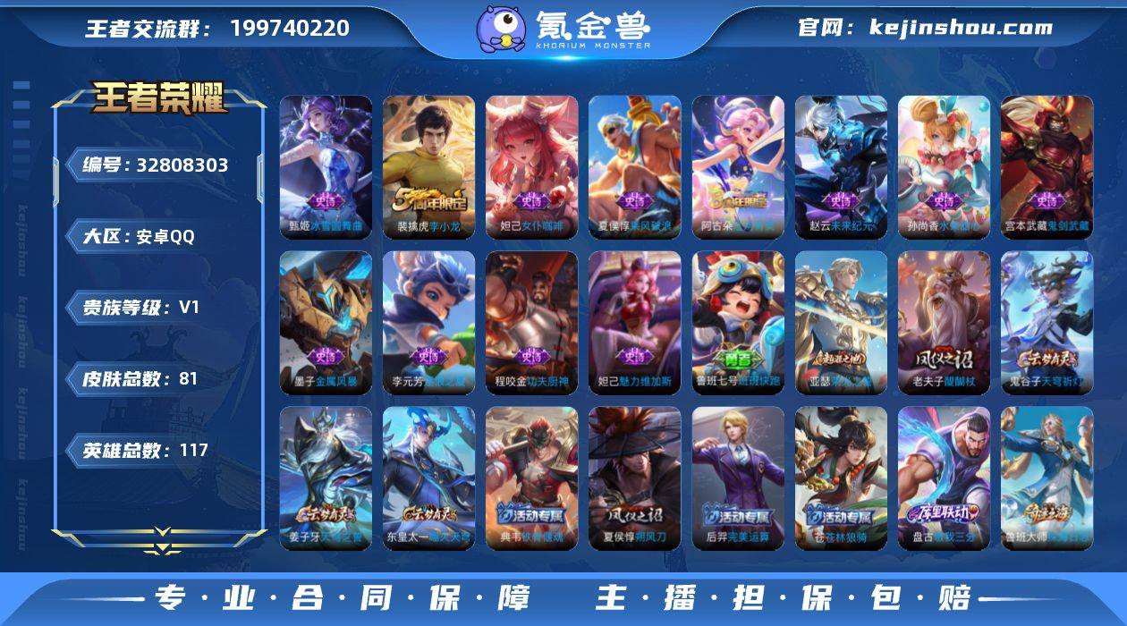【特价出售·总皮肤81·史诗皮肤12·手慢无】 安卓Q-V0-尊贵铂金II段位-117英雄-81皮肤-12史诗 【限定皮肤】:姜子牙天穹之誓,狄仁杰阴阳师,夏侯惇朔风刀,狄仁杰万华元夜,达摩沙漠行僧,老夫子醍醐杖,程咬金演武夺筹,钟馗驱傩正仪,鬼谷子原初探秘者,苏烈千军破阵,弈星混沌棋,明世隐疑决卦,裴擒虎李小龙,鲁班大师探海日志,阿古朵江河有灵,张良古海寻踪,鬼谷子天穹祈灯,周瑜熔金海岸 【赛季限定】:夏侯惇朔风刀,弈星混沌棋,明世隐疑决卦,老夫子醍醐杖,鬼谷子原初探秘者,狄仁杰万华元夜,程咬金演武夺筹,钟馗驱傩正仪,苏烈千军破阵,达摩沙漠行僧,鲁班大师探海日志,张良古海寻踪,鬼谷子天穹祈灯,姜子牙天穹之誓,东皇太一噬灭天穹,亚瑟荣光之誓 【史诗皮肤】:阿古朵江河有灵,裴擒虎李小龙,程咬金功夫厨神,李元芳逐浪之夏,夏侯惇乘风破浪,墨子金属风暴,妲己女仆咖啡,妲己魅力维加斯,孙尚香水果甜心,宫本武藏鬼剑武藏,甄姬冰雪圆舞曲,赵云未来纪元 【其他皮肤】:鲁班七号班班快跑,亚瑟荣光之誓,典韦铁骨偃魂,苍苍林狼骑,东皇太一噬灭天穹,盘古敬我三分,周瑜熔金海岸,姜子牙天穹之誓,廉颇功夫炙烤,鬼谷子天穹祈灯,后羿完美运算,...