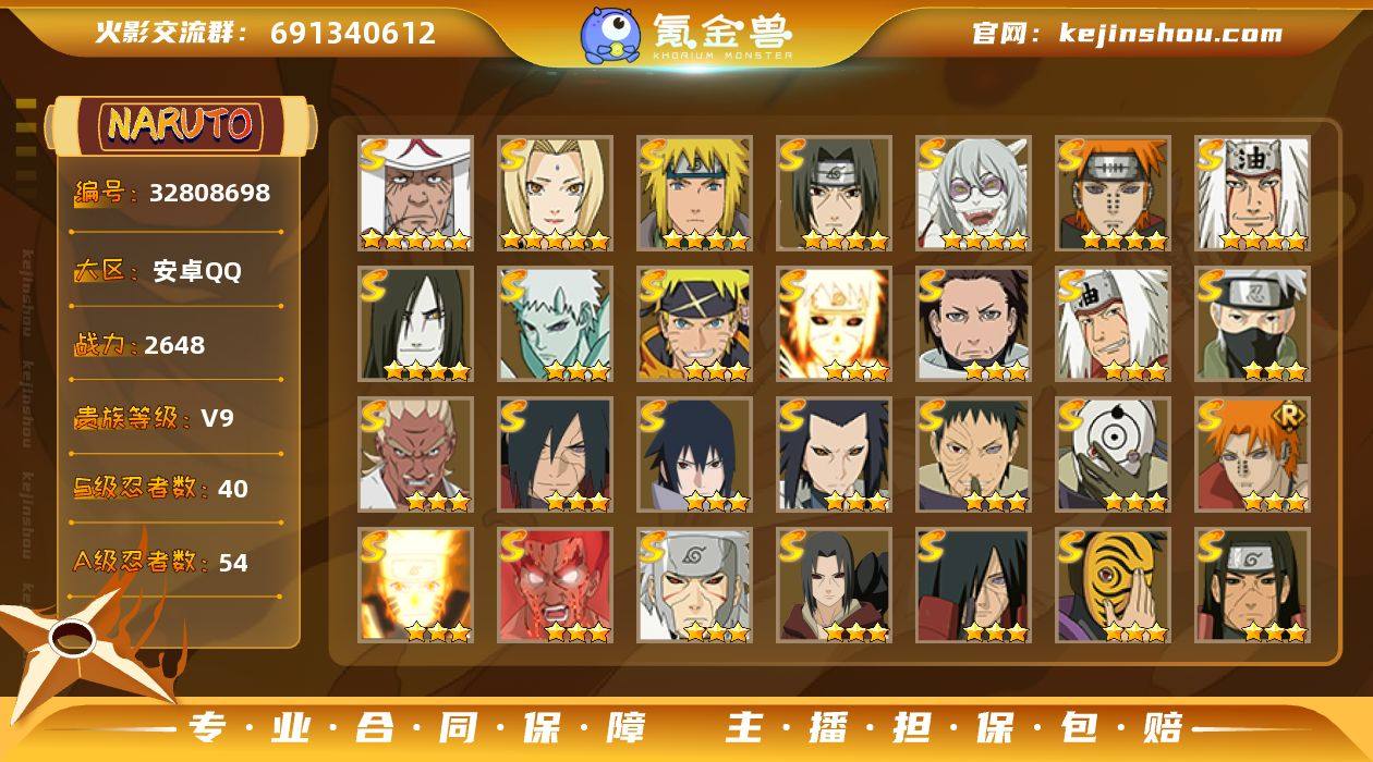 【HD100】安卓Q区 【V9 40S忍 54A忍 22通灵 2648.4W战力】百豪纲手、六道带土、超哥、破面、白面具 【S级忍者】:长门「秽土转生」(3星),三代目风影「秽土转生」(3星),猿飞日斩「秽土转生」(3星),波风水门「秽土转生」(3星),千手扉间「秽土转生」(3星),千手柱间「秽土转生」(3星),宇智波鼬「秽土转生」(3星),宇智波斑「秽土转生」(3星),宇智波斑「秽土转生·解」(3星),春野樱「忍界大战」(3星),宇智波带土「忍界大战」(3星),艾「忍界大战」(3星),宇智波鼬「须佐能乎」(4星),旗木卡卡西「须佐能乎」(3星),艾「四代目雷影」(3星),大野木「三代目土影」(3星),烈斗「初代目风影」(3星),自来也(4星),自来也「仙人模式」(3星),自来也「舞之豪杰」(3星),大蛇丸(4星),自来也「传说中的三忍」(3星),纲手(5星),纲手「百豪」(3星),千手柱间(3星),千手扉间(3星),猿飞日斩(5星),宇智波斑(3星),波风水门(4星),药师兜「仙人模式」(4星),神秘面具男(3星),漩涡鸣人「九喇嘛连结」(3星),迈特凯「死门」(3星),佩恩「天道」(4星),佩恩·天道「超」(3星),宇智波佐助「永恒万花筒」(3星),宇智波斑 「白面具」(3星宇智波斑「白面具」),波风水门「九喇嘛连结」(3星...