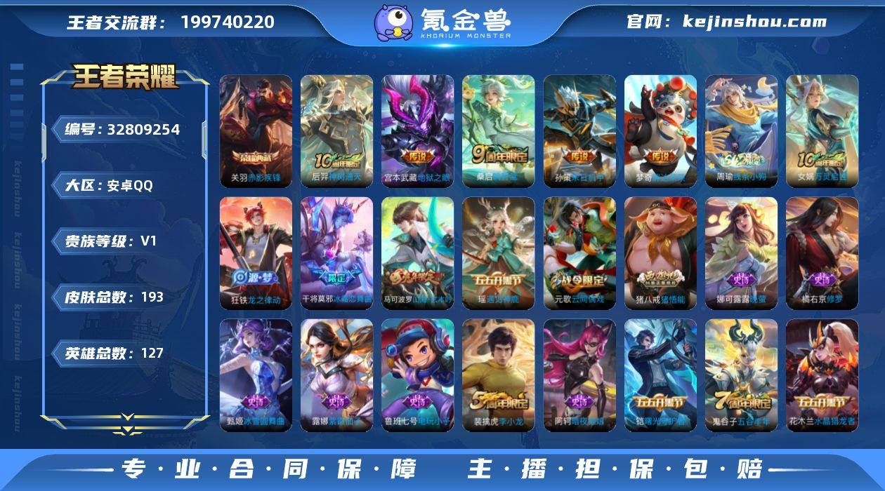 安卓Q-V1-永恒钻石IV段位-127英雄-193皮肤-1典藏皮肤-5传说-56史诗 【荣耀典藏】:关羽赤影疾锋 【传说皮肤】:后羿神树通天,桑启鸣野蒿,孙策末日机甲,梦奇胖达荣荣,宫本武藏地狱之眼 【限定皮肤】:蒙犽顽岩魄,姜子牙天穹之誓,狄仁杰阴阳师,赵云皇家上将,嬴政优雅恋人,孙尚香蔷薇恋人,庄周高山流水,高渐离玩趣恶龙,元歌云间偶戏,夏侯惇朔风刀,马可波罗山海玄木吟,狄仁杰万华元夜,达摩沙漠行僧,项羽海滩派对,老夫子醍醐杖,程咬金演武夺筹,兰陵王金庭之子,亚瑟潮玩骑士王,李元芳云中旅人,钟馗驱傩正仪,杨玉环遇见飞天,干将莫邪冰霜恋舞曲,雅典娜黎明之约,蔡文姬繁星吟游,鬼谷子原初探秘者,鬼谷子五谷丰年,苏烈千军破阵,弈星混沌棋,沈梦溪大漠名商,明世隐疑决卦,裴擒虎李小龙,裴擒虎擒涛扼浪,云中君纤云弄巧,伽罗天狼溯光者,猪八戒猪悟能,上官婉儿梁祝,鲁班大师探海日志,桑启海盐诗旅,阿古朵江河有灵,张良古海寻踪,鬼谷子天穹祈灯,沈梦溪龙舞盛年,刘邦剑破天穹,周瑜熔金海岸 【年限皮肤】:马可波罗山海玄木吟 【赛季限定】:夏侯惇朔风刀,弈星混沌棋,明世隐疑决卦,老夫子醍醐杖,鬼谷子原初探秘者,狄仁杰万华元夜,程咬金...