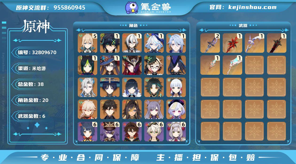 邮箱: 未绑定 总黄数: 38 冒险等级: 59 5命金色角色: 五命琴 1命金色角色: 一命莫娜,一命神里绫人,一命提纳里,一命芙宁娜,一命阿蕾奇诺,一命基尼奇 0命金色角色: 枫原万叶,神里绫华,七七,刻晴,钟离,魈,夜兰,流浪者,迪希雅,那维莱特,克洛琳德,艾梅莉埃,恰斯卡 拥有武器: 狼的末路,天空之翼,阿莫斯之弓,天空之脊,赤月之形,赦罪 2精武器: 赦罪 1精武器: 狼的末路,天空之翼,阿莫斯之弓,天空之脊,赤月之形