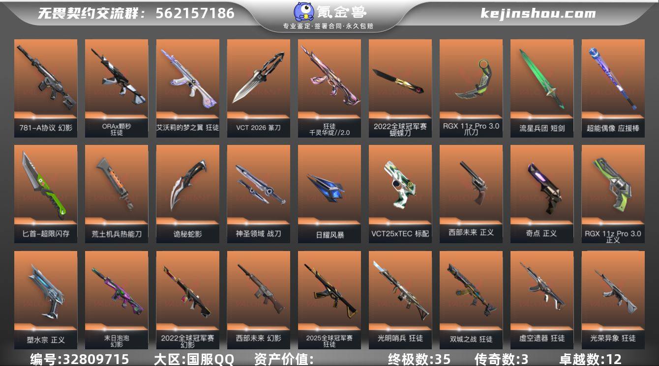 【943931】【7.7w库存22冠军套.VCT26纂刀.黑波之刃.紫金爪.威龙之刃.十六狂徒五幻影塑水宗.混沌.双城.虚空.光荣异象.颗秒.猫猫.末日泡泡.781协议】YXy6351【无二次】【因赛季更新游戏段付以上号为准!】 【套装】:2022全球冠军赛套装,VCT 2026 赛季套装,西部未来套装,RGX 11z Pro//3.0套装 【英雄】:幻棱,炼狱,维斯,暮蝶,钛狐,壹决,铁臂,捷风,雷兹,幽影,不死鸟,贤者,猎枭,蝰蛇,零,芮娜,奇乐,尚勃勒,霓虹,斯凯,夜露,星礈,K/O,海神,盖可,黑梦,钢锁 【近战武器】:近战武器-2022全球冠军赛 蝴蝶刀,近战武器-碎心裂刃,近战武器-VCT 2026 篆刀,近战武器-紫金爪刀,近战武器-RGX 11z Pro//3.0 爪刀,近战武器-黑波之刃,近战武器-威龙之刃,近战武器-未来开拓者,近战武器-流星兵团 短剑,近战武器-超能偶像 应援棒,近战武器-超限闪存 匕首,近战武器-荒土机兵 热能刀,近战武器-诡秘蛇影 军刀,近战武器-神圣领域 战刀,近战武器-日耀风暴 遗器 【狂徒】:狂徒-2025全球冠军赛,狂徒-光明哨兵,狂徒-混沌序曲,狂徒-双城之战,狂徒-塑水宗,狂徒-虚空遗器,狂徒-光荣异象,狂徒-ORA x 颗秒,狂徒-千灵华绽//2.0,狂徒-艾沃莉的梦之翼,狂徒-堕天...