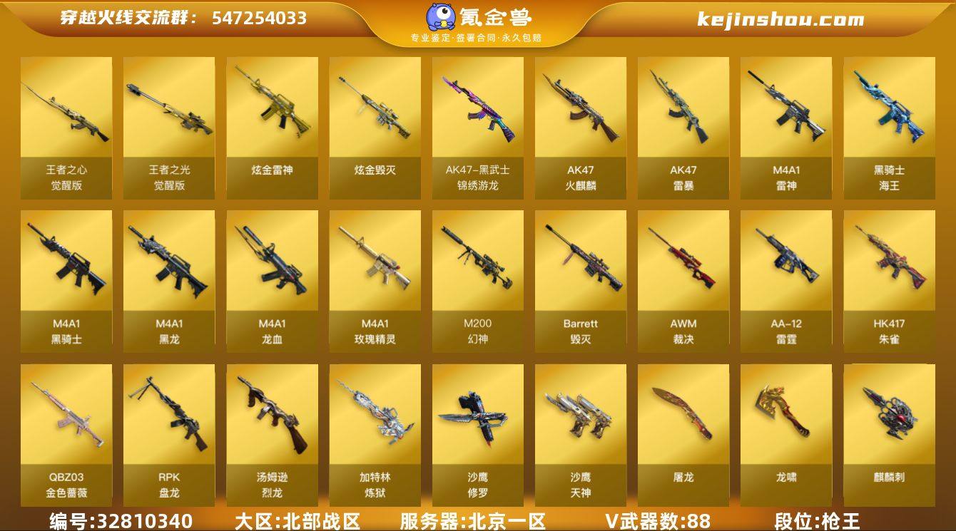 北京一区-92V-2王者-2炫金 【热门武器】:QBZ03-金色蔷薇,HK417-朱雀*2,M200-幻神,死亡之眼,M4A1-黑骑士,汤姆逊-烈龙*6,RPK-盘龙*6,加特林-炼狱*2,斯泰尔-蝴蝶,USP-雷暴*3,沙鹰-修罗*2 【王者炫金武器】:炫金雷神,炫金毁灭 【音效卡】:Barrett-碧霄极光音效卡 【皮肤】:雷神-机甲刑天皮肤,火麒麟-AG战队皮肤,火麒麟-平天大圣,火麒麟-百城,毁灭-黑大圣皮肤,M4A1-千变-孔明皮肤*2,战神-粉色甜心皮肤,战神-紫绶金章皮肤,AK47-B-常胜将军-曹操,AK47-B-常胜将军-刘备,AK47-B-常胜将军-孙权 【角色】:葵,樱,魅影,战地猎狐,云海玲珑,炽天使,娟娟,灵狐者-七夕宝贝,潜龙队-X,斯沃特-X,铁骑荣耀,樱-战斗天使,职业选手 【人偶武器】:斯泰尔-蝴蝶,迷你牛魔王,闪光弹-小乔,闪光弹-貂蝉,高爆手雷-大乔,灵狐娃娃手雷 【暴走生化】:死亡之眼,超级对讲机 【英雄级武器】:AK47-火麒麟*2,M4A1-黑龙,M4A1-雷神*2,M4A1-黑骑士,M4A1-龙血,AK47-雷暴,HK417-朱雀*2,黑武士-锦绣游龙,M4A1-玫瑰精灵*2,QBZ03-金色蔷薇,王者之心-觉醒版,AK-47-猩红传说*9,AK47-B-战神*2,黑骑士-海王*2,AK47-B-常胜将军,Barrett-毁灭,AWM-裁决,M200-幻神,...