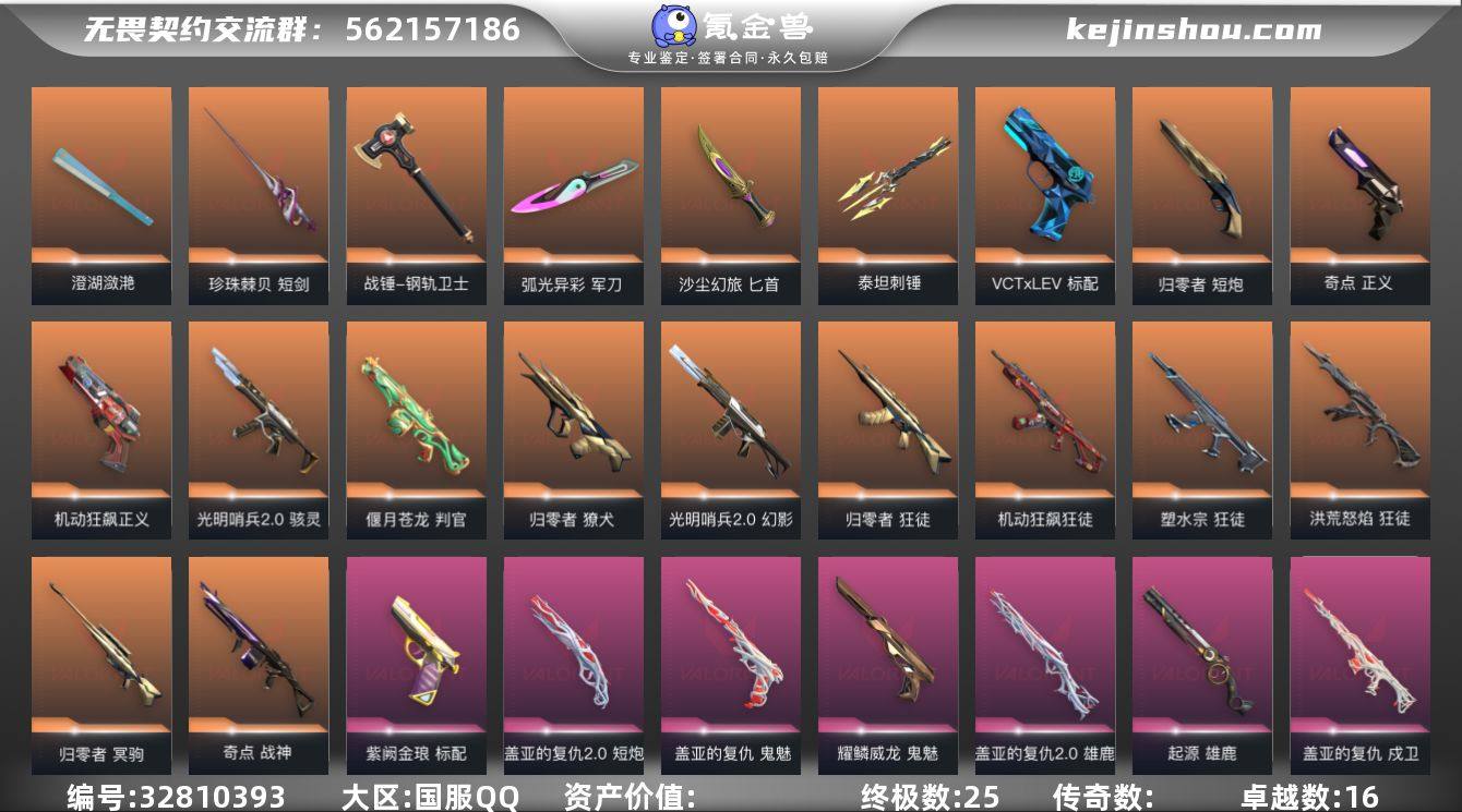 【套装】:归零者套装,盖亚的复仇套装,盖亚的复仇//2.0套装,耀鳞威龙套装 【英雄】:炼狱,暮蝶,壹决,铁臂,捷风,雷兹,幽影,不死鸟,贤者,猎枭,蝰蛇,零,芮娜,霓虹,斯凯,夜露,星礈,K/O,盖可,黑梦,钢锁 【近战武器】:近战武器-剥皮小刀,近战武器-威龙之刃,近战武器-澄湖潋滟,近战武器-珍珠棘贝 短剑,近战武器-盖亚之怒,近战武器-盖亚之愠,近战武器-钢轨卫士 战锤,近战武器-弧光异彩 军刀,近战武器-沙尘幻旅 匕首,近战武器-生物收割器,近战武器-泰坦刺锤 【狂徒】:狂徒-归零者,狂徒-洪荒怒焰,狂徒-机动狂飙,狂徒-塑水宗,狂徒-冰点凝冻,狂徒-堕天遗武,狂徒-盖亚的复仇,狂徒-耀鳞威龙,狂徒-紫阙金琅,狂徒-钢轨卫士,狂徒-弧光异彩,狂徒-沙尘幻旅 【幻影】:幻影-光明哨兵//2.0,幻影-盖亚的复仇//2.0,幻影-侦察力量,幻影-噬源兽防卫工程,幻影-珍珠棘贝,幻影-战术小伙伴 【戍卫】:戍卫-盖亚的复仇,戍卫-钢轨卫士,戍卫-珍珠棘贝,戍卫-彩梦之城,戍卫-萌彩剪影,戍卫-沙场老兵 【獠犬】:獠犬-归零者,獠犬-弧光异彩,獠犬-复古浪潮,獠犬-胡桃狂想,獠犬-战术小伙伴 【冥驹】:冥驹-归零者,冥驹-复古浪潮,冥驹-胡桃狂想,冥驹-...