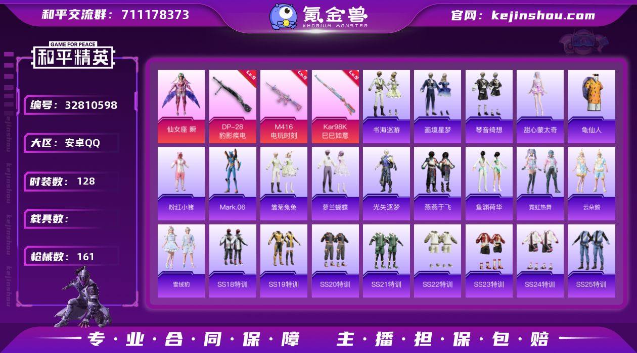 【kyhp1358】安卓 手Q-2粉装-6特效枪-0载具-1粉色飞行器-44001热力值-11王牌印记-128套装-161枪皮 【热门品类】:套装-龟仙人,套装-粉红小猪,角色-Mark.06 【粉色套装】:角色-仙女座 瞬,角色-罪夜之冕 【粉色枪皮等级】:M416-电玩时刻(五级),ACE32-萌骑漫游(三级),AKS-74U-森灵之息(五级),Kar98K-巳巳如意(五级),Mk14-福马献瑞(五级),DP-28-豹影疾电(五级) 【粉色枪皮】:M416-电玩时刻,ACE32-萌骑漫游,AKS-74U-森灵之息,Kar98K-巳巳如意,Mk14-福马献瑞,DP-28-豹影疾电 【粉色飞行器】:炫彩糖果飞行器 【粉色降落伞】:绝对恒星降落伞,沙丘之主降落伞,精灵梦叶罗丽降落伞,临安公主降落伞,炫彩糖果降落伞,虎痴许褚降落伞 【稀有套装】:套装-龟仙人,角色-甜心蒙太奇,套装-雪国风尚,套装-炫彩糖果,套装-马上来财,套装-迅捷龙虾,套装-雏菊兔兔,套装-萝兰蝴蝶,角色-光矢逐梦,套装-燕燕于飞,套装-鱼渊荷华,套装-霓虹热舞,套装-云朵鹅,套装-雪绒豹,套装-书海巡游,套装-画境星梦,套装-琴音绮想,角色-月烬之祷,套装-雨过天青,套装-红釉青花 【稀有枪皮】:AUG-冰晶雪宝,AKM-破晓战魂,AKM-霓虹街区,AKM-玄冥寒域,M16A4-幻世战舞者,M16A4-...