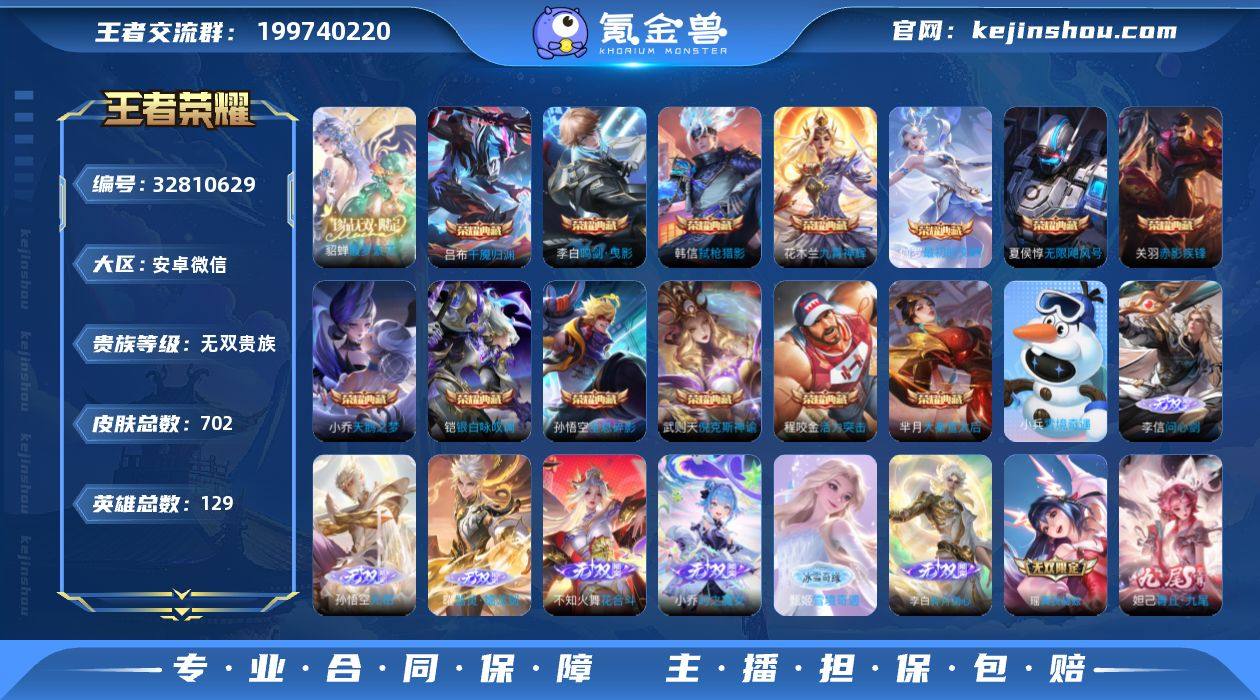 安卓WX-V11-最强王者段位-129英雄-702皮肤-13典藏皮肤-1典藏英雄-1珍品无双-9无双-10珍品传说-118传说-251史诗