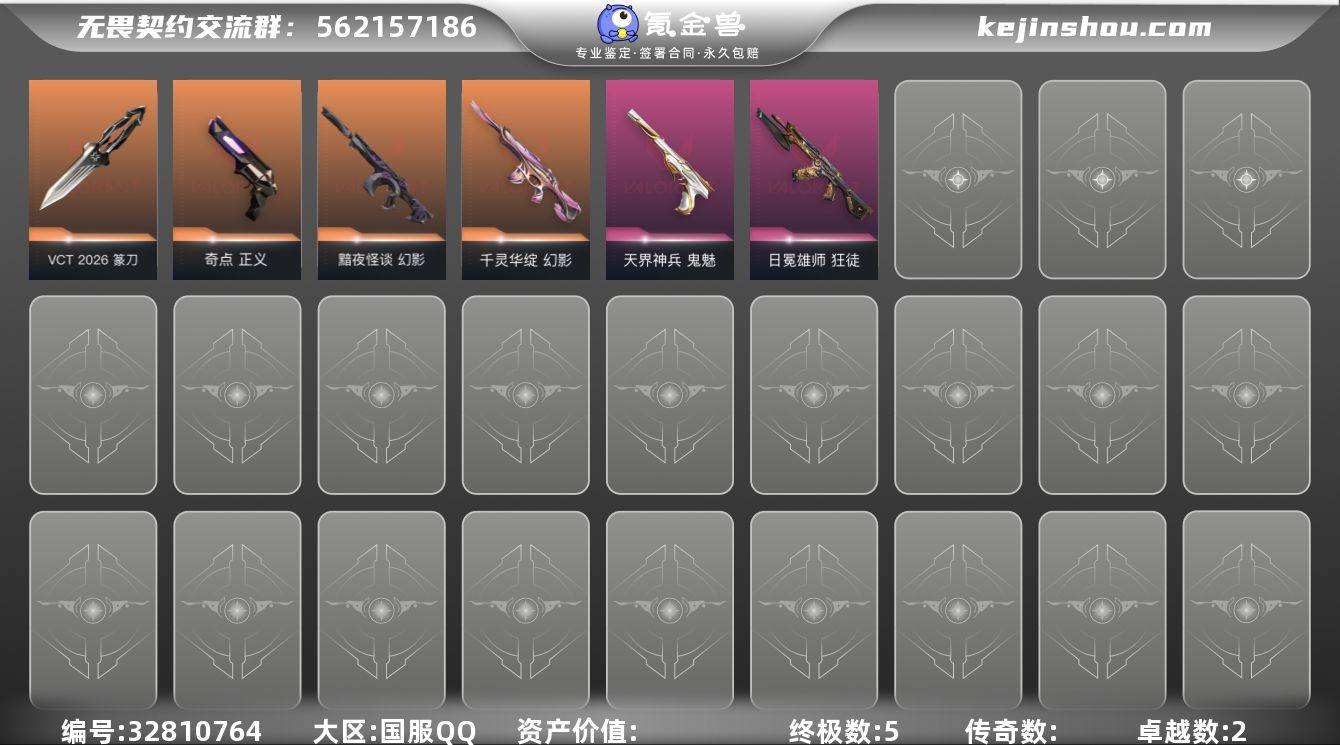 【套装】:VCT 2026 赛季套装 【英雄】:幻棱,炼狱,维斯,暮蝶,壹决,捷风,不死鸟,贤者,猎枭,芮娜,海神,盖可,黑梦 【近战武器】:近战武器-VCT 2026 篆刀 【狂徒】:狂徒-日冕雄师 【幻影】:幻影-黯夜怪谈,幻影-千灵华绽 【正义】:正义-奇点 【鬼魅】:鬼魅-天界神兵 【卡面】:南瓜盛典 卡面,无畏契约GO!第一卷:零 卡面,代号红色 卡面,新兵报到 卡面,V契约 卡面,无畏契约 卡面 【喷漆】:霓光四射 喷漆,买装还是存钱 喷漆,无畏契约GO!第一卷:捷风 喷漆,放下武器 喷漆,胜利属于无畏契约 喷漆,GLHF 喷漆,无畏契约 喷漆 【挂饰】:Z世代特饮 挂饰,红鳞松叶 挂饰,无畏契约 纪念币 挂饰