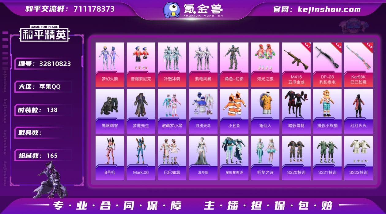 不可二次 苹果 手Q-6粉装-5特效枪-0载具-2粉色飞行器-49082热力值-13王牌印记-138套装-165枪皮 QW2632017 【热门品类】:粉装-梦幻火箭,粉装-音爆索尼克,套装-浪漫天命,套装-小丑鱼,套装-龟仙人,套装-暗影哥特,套装-摄影小熊猫,套装-红红火火,角色-8号机,角色-Mark.06 【粉色套装】:粉装-梦幻火箭,粉装-冷魅冰骑,粉装-紫电风暴,粉装-音爆索尼克,角色-幻影,粉装-炫光之旅 【粉色枪皮等级】:M416-五爪金龙(七级),ACE32-萌骑漫游(四级),Kar98K-巳巳如意(五级),Mk14-福马献瑞(五级),DP-28-豹影疾电(五级) 【粉色枪皮】:M416-五爪金龙,ACE32-萌骑漫游,Kar98K-巳巳如意,Mk14-福马献瑞,DP-28-豹影疾电 【粉色飞行器】:炫彩糖果飞行器,炫紫旋律飞行器 【粉色降落伞】:至尊龙雀降落伞,梦幻火箭降落伞,暗夜鎏金降落伞,第五大道降落伞,纯梦嫁纱降落伞,梦幻舞会降落伞,飒粉甜心降落伞,未来歌姬降落伞,炫光之旅降落伞,魔童闹海 敖丙降落伞,炫彩糖果降落伞 【稀有套装】:套装-龟仙人,套装-巳巳如意,套装-雪国风尚,套装-炫彩糖果,套装-马上来财,角色-海琴烟,套装-星影赞美诗,套装-折梦之诗,套装-雨过天青,套装-红釉青花 【稀有枪皮】:AUG-...