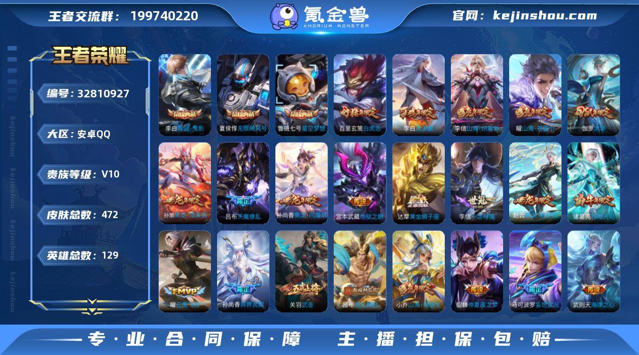 品传说 44传说 129英雄 472皮肤 典藏英雄武则天 可修改实名 【英雄全皮】廉颇全皮,梦奇全皮,空空儿全皮,孙权全皮,蚩奼全皮,狂铁全皮,海诺全皮,刘邦全皮,莱西奥全皮,猪八戒全皮,大禹全皮 【稀有英雄】大司命,敖隐(小龙人),夏洛特(夏师傅),金蝉(唐僧),戈娅,赵云,嬴政(始皇帝),韩信(韩跳跳),艾琳,不知火舞,娜可露露(鸟人),橘右京(橘子) 【荣耀水晶】无限飓风号(高达),星空梦想(太空人),鸣剑·曳影 【珍品传说】怪盗基德 【传说皮】时之恋人-刘备(电焊工),绛天战甲(鸡嘴战神),乘龙·铭钟鼎(赵云年限),山海·琳琅生(小乔年限),山海·炽霜斩(李信年限),一念神魔,乘龙·淬吴钩(孙策年限),末日机甲-孙尚香(绿蚂蚱),黄金狮子座,乘龙·问璇玑(孙尚香年限),遇见神鼓,海洋之心,地狱之眼,惊梅引,仲夏夜之梦(大飞蛾),冠军飞将,妄想实况,艾琳觅芳踪,黄金白羊座,超时空战士-狄仁杰,云鹰飞将(小将军),地狱火,山海·苍雷引(电光曜子),碎云,云霓雀翎,鹤归松栖(云缨),胖达荣荣 【珍宝阁皮】蔷薇恋人,妄想食味,优雅恋人 【赛季/战令皮】夺宝奇兵,朔风刀(s17),剑破天穹(s35),火炮绅士,醍醐杖(s20),星空之诺,落雪兰心,大漠名商(s28),御銮(s16),超时空战士-钟无艳,烛龙(s10),妖精王(s5),千军破阵(s25),...