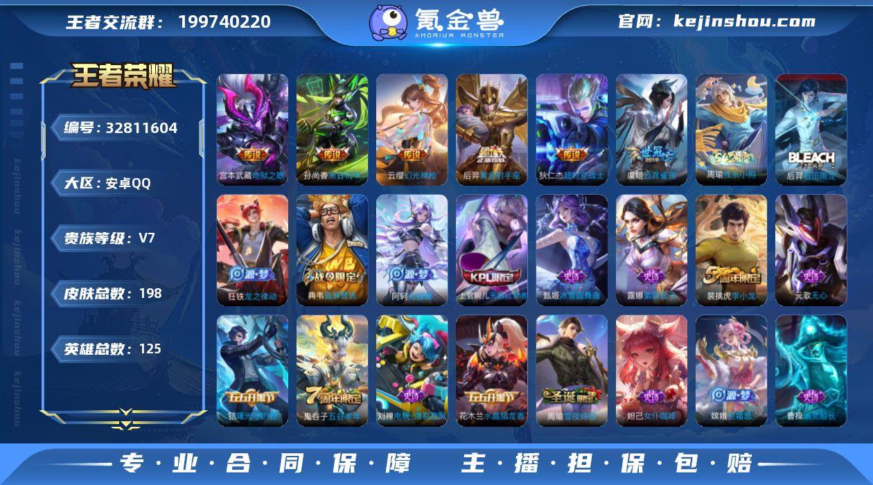 安卓Q-V7-最强王者段位-125英雄-198皮肤-6传说-46史诗 【传说皮肤】:云缨幻光神枪,虞姬云霓雀翎,后羿黄金射手座,孙尚香末日机甲,宫本武藏地狱之眼,狄仁杰超时空战士 【限定皮肤】:狄仁杰阴阳师,赵云皇家上将,孙尚香蔷薇恋人,庄周高山流水,芈月重明,元歌无心,夏侯惇朔风刀,甄姬游园惊梦,曹操烛龙,典韦穷奇,典韦蓝屏警告,狄仁杰魔术师,狄仁杰万华元夜,达摩沙漠行僧,项羽海滩派对,老夫子醍醐杖,程咬金演武夺筹,兰陵王金庭之子,牛魔御旌,李元芳云中旅人,钟馗驱傩正仪,女娲朔望之晖,干将莫邪胡桃夹子,蔡文姬繁星吟游,鬼谷子原初探秘者,鬼谷子五谷丰年,苏烈千军破阵,弈星混沌棋,沈梦溪大漠名商,明世隐疑决卦,裴擒虎李小龙,裴擒虎擒涛扼浪,狂铁御狮,米莱狄御霄,云中君纤云弄巧,盾山御銮,上官婉儿梁祝,上官婉儿天狼绘梦者,嫦娥拒霜思,鲁班大师探海日志,桑启海盐诗旅,阿古朵江河有灵,张良古海寻踪,蒙犽百解令,鬼谷子天穹祈灯,刘邦剑破天穹,刘备异域游侠,周瑜熔金海岸 【赛季限定】:曹操烛龙,芈月重明,典韦穷奇,狂铁御狮,米莱狄御霄,牛魔御旌,盾山御銮,夏侯惇朔风刀,弈星混沌棋,明世隐疑决卦,老夫子醍醐杖,鬼谷子原...