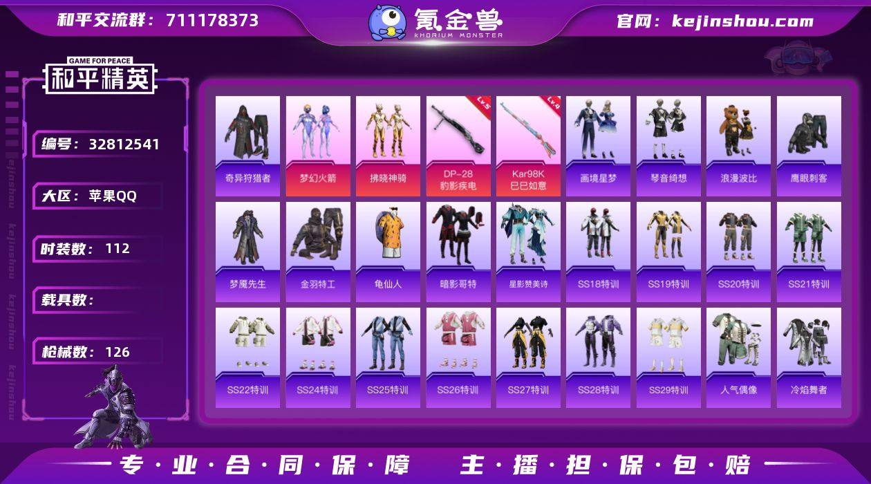 苹果 手Q-3粉装-5特效枪-0载具-1粉色飞行器-35657热力值-6王牌印记-112套装-126枪皮 【热门品类】:粉装-梦幻火箭,套装-奇异狩猎者,套装-金羽特工,套装-龟仙人,套装-暗影哥特,套装-浪漫波比 【粉色套装】:粉装-梦幻火箭,粉装-拂晓神骑,角色-罪夜之冕 【粉色枪皮等级】:ACE32-萌骑漫游(四级),AKS-74U-森灵之息(五级),Kar98K-巳巳如意(四级),Mk14-福马献瑞(五级),DP-28-豹影疾电(五级) 【粉色枪皮】:ACE32-萌骑漫游,AKS-74U-森灵之息,Kar98K-巳巳如意,Mk14-福马献瑞,DP-28-豹影疾电 【粉色飞行器】:拂晓神骑飞行器 【粉色降落伞】:快乐主宰降落伞,恐龙拽拽降落伞,星夜魔法师降落伞,垂柳戏鸭降落伞,拂晓神骑降落伞,超新星降落伞,初号机 觉醒Ver.降落伞 【稀有套装】:套装-龟仙人,套装-迅捷龙虾,套装-星影赞美诗,套装-画境星梦,套装-琴音绮想,套装-雨过天青,套装-红釉青花,角色-皓月伶影 【稀有枪皮】:AKM-2P战斗服款,AKM-奇异狩猎者,AKM-影袭,AKM-恐龙拽拽,AKM-海渊国主,AKM-破晓战魂,AKM-龙的传人,M16A4-幻世战舞者,SCAR-L-夜灯,SCAR-L-炫彩节奏,SCAR-L-玉兔迎春,SCAR-L-红色方程式,SCAR-L-青丘仙客,SCAR-L-黄金龙骨,M416-糯...