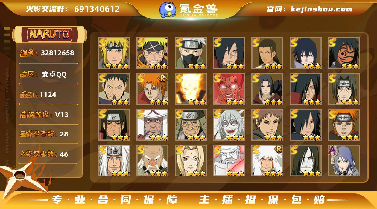 【火影忍者】战斗力:1124W+;段位:暗部2阶;本服排名:346;VIP:V13级;S忍:28个;A忍:46个;通灵兽:21个,S忍:秽土转生解宇智波斑|白面具宇智波斑|忍界大战宇智波带土|须佐能乎旗木卡卡西|超佩恩天道|天道佩恩|漩涡鸣人宇智波佐助|秽土转生千手柱间|木叶创立宇智波斑|秽土转生宇智波鼬|永恒万花筒宇智波佐助|木叶创立千手柱间|舞之豪杰自来也|大蛇丸(普通)|纲手(普通)|波风水门 * 4星|秽土转生宇智波斑|须佐能乎宇智波鼬|红夜之刃神秘面具男|四代目风影罗砂|仙人模式药师兜|死门迈特凯|忍界大战大野木|九喇嘛连结漩涡鸣人|博人传大筒木金式|猿飞日斩(普通)|秽土转生猿飞日斩|自来也(普通)__A忍:青春爆炸迈特凯|漂泊浪客宇智波带土|仙人模式巳月|忍界大战李洛克|新春限定我爱罗|忍界大战日向宁次|四代目土影黑土|火之意志继承者卑留呼|青年长门|忍者之路神秘面具男|秽土转生迪达拉|新春限定宇智波止水|不风|新春限定迪达拉|忍界大战奇拉比|青年波风水门|青年艾|漂泊武士千手扉间|漂泊武士桃地再不斩|近松十人卫千代|须佐能乎宇智波佐助|新春限定小南|暴怒宇智波带土|晓大蛇丸|百豪春野樱|忍界大战秋道丁次|新春限定波风水门|奇拉比(普通)|万花筒写轮眼宇智波...