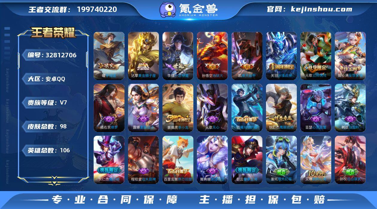 【王者荣耀】珍品无双0 典藏0 无双0 珍品传说0 传说7 史诗18 英雄106 皮肤98 贵族7级 传说皮肤:绛天战甲|地狱火|黄金狮子座|狄仁杰-超时空战士|一念神魔|李逍遥|孙尚香-末日机甲__稀有限定:李小龙|冰锋战神|海滩派对|皇家上将|魔术师|驱傩正仪|醍醐杖|万华元夜|妄想食味|无心|演武夺筹|阴阳师|御狮|云间偶戏|白龙吟|冰冠公主|功夫厨神|吕布-末日机甲|热力回旋|鹰眼统帅|紫霞仙子|修罗|曙光守护者|心灵战警|烛龙|原初探秘者|云中旅人|达摩-星际陆战队|逆浪荇歌|黄忠-百相守梦|荣光之誓|鹤鸣心笺|周瑜-线条小狗__优质皮肤:尼罗河女神|创世神祝|埃及法老|孤猎|木偶奇遇记|午夜歌剧院|超能战警|英喵野望|绯红之刃|生化警戒|威尼斯狂欢|潮流仙人|地府判官|福禄兄弟|隐刃|精灵王|星航指挥官|爱与和平|占星师|花间舞|灼热之刃|异域舞娘|精灵公主|修竹墨客|暗都幽影|潮玩探月行|坚韧之力|功夫老勺|命运角斗场|阿尔法小队|兔女郎|死亡骑士|黄金武士|少女阿狸|宫本武藏-未来纪元|红桃皇后|爱心护理|街头霸王|教廷特使|危途狂花|拳王|时尚教父|救世之瞳|白色死神|掌控之力|龙腾万里|敏锐之力|孙悟空-西部大镖客|乓乓大师|曜-归虚梦演|花好人间|潮玩骑士王|万象初新|踏浪烽翎|哪吒-罗小黑...