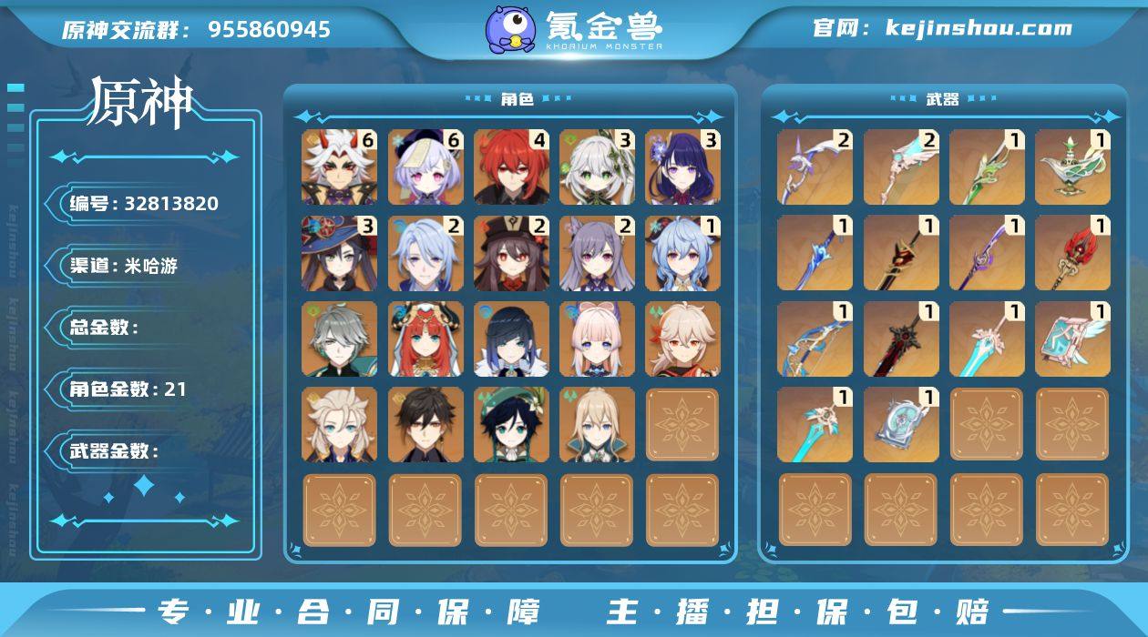 【金色角色】:艾尔海森(0命),纳西妲(3命),妮露(0命),夜兰(0命),神里绫人(2命),荒泷一斗(满命),珊瑚宫心海(0命),雷电将军(3命),枫原万叶(0命),胡桃(2命),甘雨(1命),阿贝多(0命),钟离(0命),温迪(0命),琴(0命),刻晴(2命),迪卢克(4命),莫娜(3命),七七(满命) 【拥有武器】:裁叶萃光(精1),千夜浮梦(精1),波乱月白经津(精1),赤角石溃杵(精1),薙草之稻光(精1),终末嗟叹之诗(精1),护摩之杖(精1),天空之傲(精1),天空之卷(精1),四风原典(精1),狼的末路(精1),阿莫斯之弓(精2),天空之刃(精1),天空之翼(精2) 【紫色角色】:琳妮特(0命),卡维(0命),瑶瑶(2命),珐露珊(2命),莱依拉(2命),坎蒂丝(1命),多莉(满命),柯莱(3命),鹿野院平藏(4命),久岐忍(1命),云堇(满命),五郎(满命),托马(满命),九条裟罗(满命),早柚(满命),烟绯(满命),罗莎莉亚(5命),辛焱(满命),迪奥娜(满命),砂糖(满命),雷泽(满命),菲谢尔(满命),丽莎(0命),北斗(满命),香菱(满命),安柏(满命),班尼特(满命),行秋(满命),芭芭拉(满命),凝光(满命),诺艾尔(满命),凯亚(3命),重云(满命)
