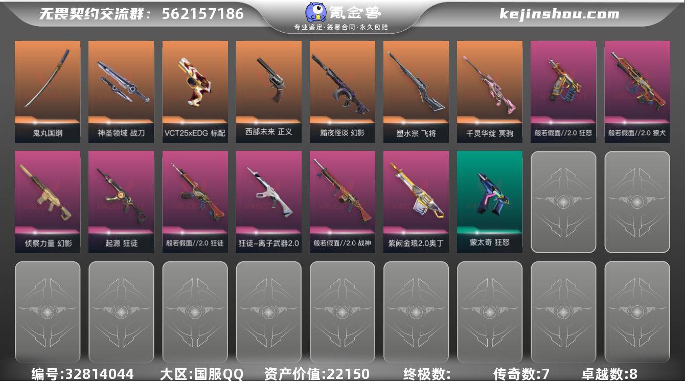 段位: 青铜 套装: 般若假面//2.0套装 近战武器皮肤: 鬼丸国纲-般若假面//2.0,神圣领域 战刀 步枪皮肤: 幻影-侦察力量,狂徒-起源,幻影-黯夜怪谈,狂徒-般若假面//2.0,獠犬-般若假面//2.0,狂徒-离子武器2.0 佩枪皮肤: 狂怒-般若假面//2.0,标配-VCT25xEDG,正义-西部未来,蒙太奇 狂怒 狙击枪皮肤: 飞将-塑水宗,冥驹-千灵华绽 机枪皮肤: 奥丁-紫阙金琅2.0,战神-般若假面//2.0 亮点: 【优质装备】:冥驹-千灵华绽,幻影-侦察力量,幻影-黯夜怪谈,狂徒-起源,奥丁-紫阙金琅2.0,飞将-塑水宗,鬼丸国纲,神圣领域 战刀