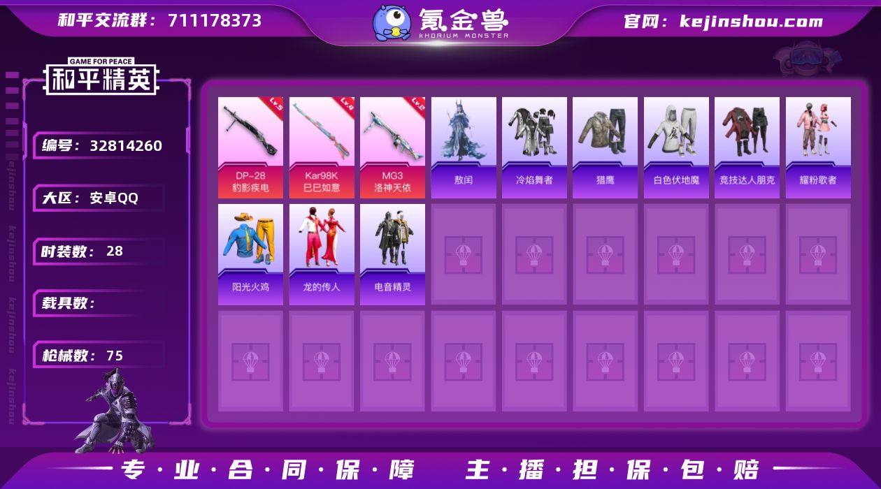 实名: 不可修改 时装数: 28 枪械数: 75 战备数: 43 稀有枪皮: MG3洛神天依,Kar98K-巳巳如意,DP-28-豹影疾电 亮点: 安卓 手Q-0粉装-4特效枪-0载具-1粉色飞行器-15781热力值-4王牌印记-28套装-75枪皮【粉色枪皮等级】:Kar98K-巳巳如意(四级),Mk14-福马献瑞(四级),DP-28-豹影疾电(五级),MG3-洛神天依(二级)【粉色枪皮】:Kar98K-巳巳如意,Mk14-福马献瑞,DP-28-豹影疾电,MG3-洛神天依【粉色飞行器】:炫彩糖果飞行器【粉色降落伞】:星穹咏叹调降落伞,炫彩糖果降落伞【稀有套装】:套装-雪国风尚,角色-敖闰【稀有枪皮】:AKM-奇异狩猎者,AKM-破晓战魂,M16A4-红色方程式,M16A4-蓝色火焰,SCAR-L-炫彩节奏,SCAR-L-红色方程式,M416-红色方程式,M416-蓝色火焰,GROZA-影袭,GROZA-暮色玫影,AUG-耀粉歌者,M762-天降萌叽,M762-彩虹符号,UZI-啾咪啾咪,UZI-影袭,UZI-红色方程式,UMP45-夜灯,UMP45-蓝色火焰,汤姆逊-奇异狩猎者,汤姆逊-耀粉歌者,汤姆逊-像素花束,Kar98K-洛神天依,Kar98K-红色方程式,AWM-暮色玫影,Mini14-耀粉歌者,S686-奇异狩猎者,S686-红色方程式,S12K-玩趣呆呆,S12K-破晓战魂,DBS-幻彩电音,M249-彩虹符号,M249-破晓战魂,M249-糯团青...