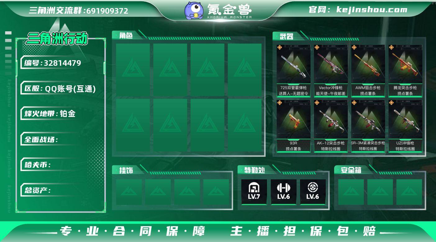 总资产:34.8M 1近战传说 32传说枪械 哈夫币:149.000K 可二次 可修改实名 【烽火地带段位】铂金 【全面战场段位】无段位 【传说武器皮肤】近战-信条,AS Val突击步枪-悬赏令(典藏),SG552突击步枪-运动员,93R-捞点薯条,AK-12突击步枪-特斯拉线圈,SR-3M紧凑突击步枪-特斯拉线圈,UZI冲锋枪-特斯拉线圈,勇士冲锋枪-能天使-午夜邮差,Vector冲锋枪-能天使-午夜邮差,M250通用机枪-骑士之心,SCAR-H战斗步枪-启航,ASh-12战斗步枪-鹅鸭杀,QCQ171冲锋枪-鹅鸭杀,QJB201轻机枪-鹅鸭杀,G3战斗步枪-骑士,KC17突击步枪-电锯惊魂,47突击步枪-悠然茶歇,M14射手步枪-缄花,AUG突击步枪-悠然茶歇,.357左轮-缄花,UZI冲锋枪-悠然茶歇,SR-25射手步枪-缄花,AWM狙击步枪-万金泪冠,SKS射手步枪-骑士,M14射手步枪-蛮荒,AWM狙击步枪-捞点薯条,腾龙突击步枪-万金泪冠,勇士冲锋枪-万金泪冠,腾龙突击步枪-捞点薯条,AKM突击步枪-零度协议,M4A1突击步枪-蚀金玫瑰,725双管霰弹枪-送葬人-无题密令