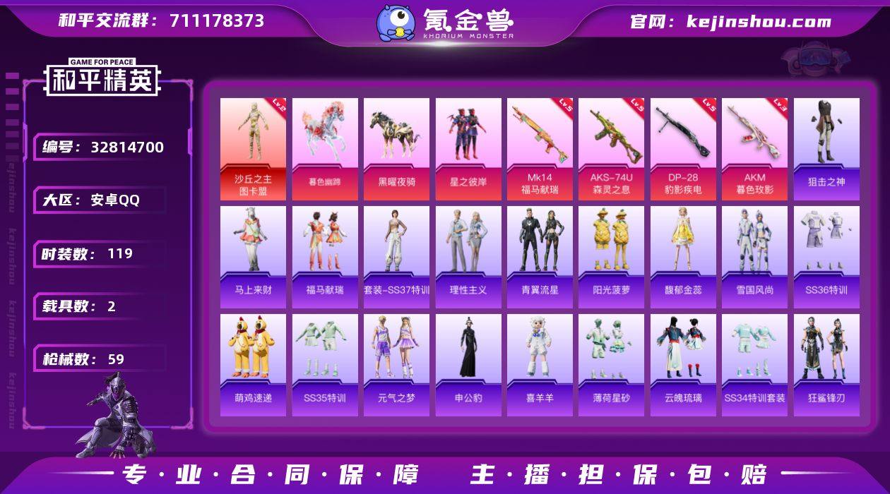 精氪素材号【2级图卡盟/小番茄/星之彼岸】小丑鱼/申公豹/满级mk14/ak暮色魅影/黑耀夜骑/暮色幽蹄 实名: 可修改 时装数: 119 载具数: 2 枪械数: 59 战备数: 42 神级装扮: 沙丘之主-图卡盟 热门装扮: 呆萌铁蟹,星之彼岸 载具: 黑曜夜骑,暮色幽蹄 稀有枪皮: DP-28-豹影疾电,AKM-暮色玫影,AKS-74U-森灵之息