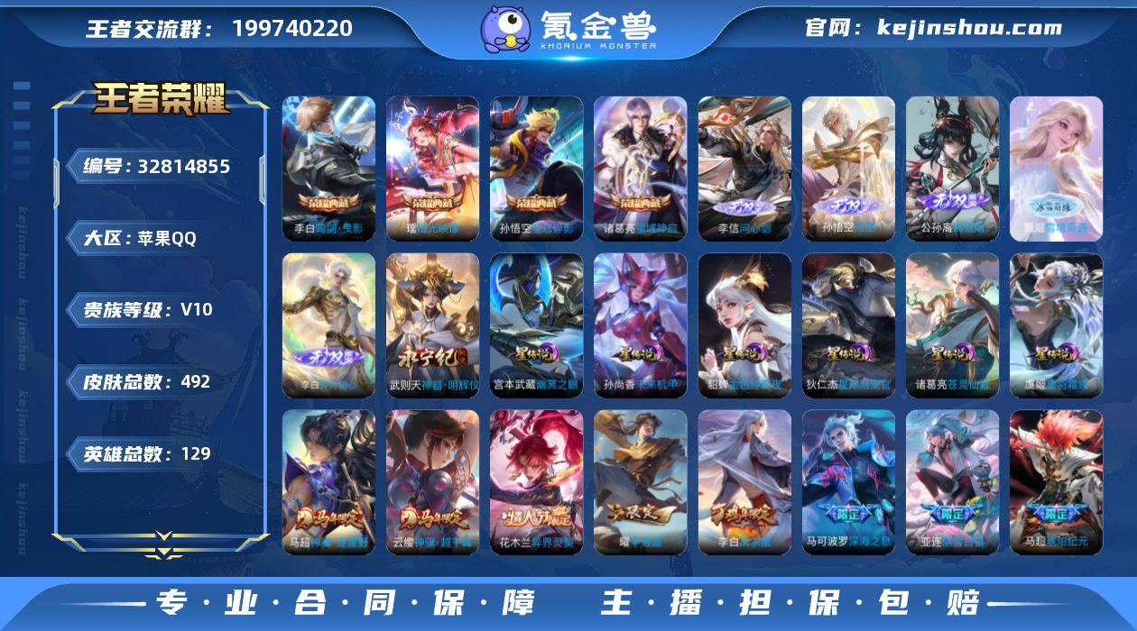 【高性价比v10·5典藏·6无双·7星传说·62传说·2.2W流光积分·珍奇宝·全息碎影·鸣剑曳影·星域神启·拾光映像·离恨烟·问心剑·无相·雪境奇遇·碎月剑心·苍灵仙君·黛羽霜翎·满龙年限定·满兔年限定·李逍遥·神骥越千峰·神骥逐星野·可二次】YXw21884-苹果Q-129英雄-492皮肤-13王者印记-300铭文-贵族积分31w【贵族10】【v10·5典藏·6无双·7星传说·62传说·1天幕·31按键·7个性戳戳】【因赛季更新游戏段付以上号为准!】 【英雄全皮】:墨子全皮,刘邦全皮,孙权全皮,娜可露露全皮,橘右京全皮,孙悟空全皮,李信全皮,盾山全皮,敖隐全皮,鲁班大师全皮,阿古朵全皮,金蝉全皮,空空儿全皮,影全皮,海诺全皮 【荣耀典藏】:武则天英雄,孙悟空全息碎影,李白鸣剑曳影,诸葛亮星域神启,瑶拾光映像 【无双皮肤】:李信问心剑,孙悟空无相,甄姬雪境奇遇,公孙离离恨烟,李白碎月剑心,武则天神器明辉仪 【星元皮肤】:诸葛亮苍灵仙君,虞姬黛羽霜翎,狄仁杰星际治安官,刘备时之思念,孙尚香未来机甲,宫本武藏幽冥之眼,貂蝉金色仲夏夜 【天幕】:共赏芳华天幕 【传说皮肤】:云缨神骥越千峰,马超神骥逐星野,花木兰异界灵契,墨子黄金天蝎座,亚连落雪白狼,吕布曦玄引,貂蝉曦玄引,孙尚香...