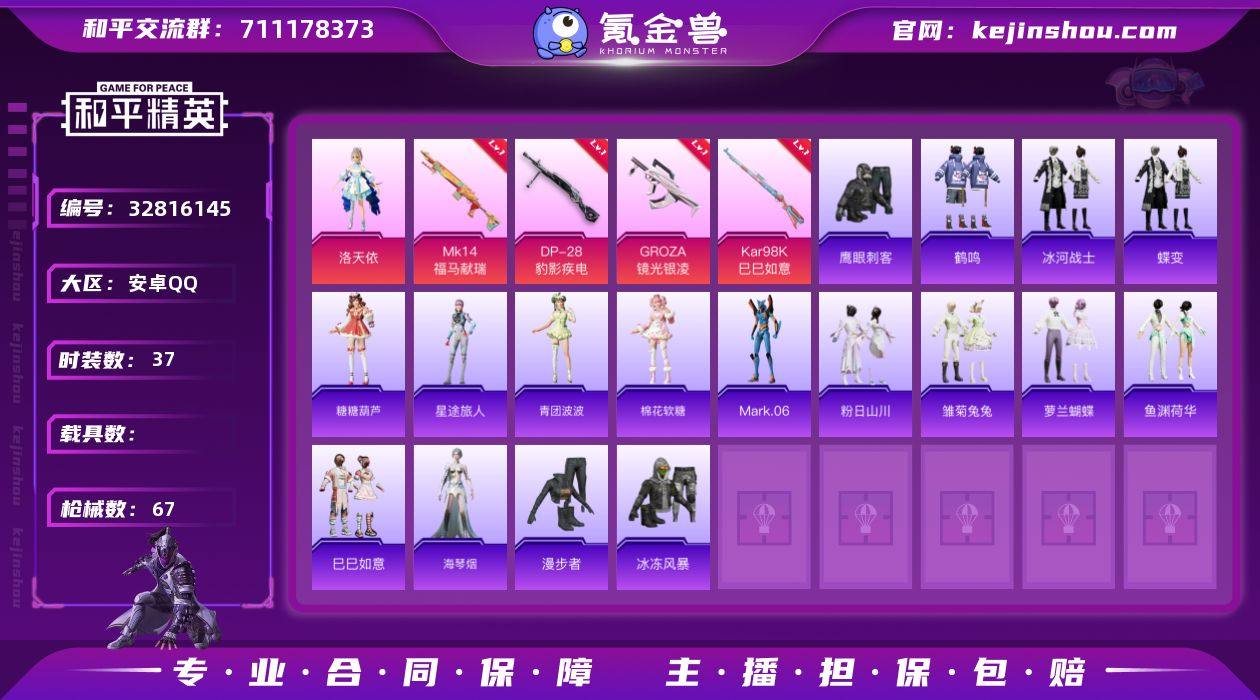M1047299【粉1 特效4 洛天依 蓝螳螂】安卓手Q-1粉装-4特效枪-37套装-67枪皮-1王牌印记-坚韧铂金Ⅳ-16457热力值【1粉装】角色-洛天依【4特效枪】Kar98K-巳巳如意[1级],DP-28-豹影疾电[3级],GROZA-镜光银凌[5级],Mk14-福马献瑞[1级]【1稀有】AKM-百万伏特【1飞行器】顶峰精英尾迹【1头盔】百万伏特头盔【98其它衣服和枪皮】绮丽涂鸦,潮流炫酷,狙击之神,SS37特训,角色-Mark.06,竞技名士,香桃花海,巳巳如意,街头风暴,蝶变,雏菊兔兔,SS29特训,老实芭蕉,萝兰蝴蝶,青团波波,白色伏地魔,角色-海琴烟,缤纷果语,糖糖葫芦,龙魂突击队,长空猛禽,战术大师,星途旅人,SS31特训,鱼渊荷华,粉日山川,漫步者,冰河战士,街头潮人,SS34特训,鹤鸣,棉花软糖,冰冻风暴,SS30特训,魅力单车,鹰眼刺客,Kar98K-幻影战神,M762-天降萌叽,Vector-创世·救赎,Mini14-香桃花海,UZI-啾咪啾咪,破片手榴弹-星途旅人,M249-破晓战魂,破片手榴弹-呆爆全场,Mk14-薄荷星砂,20-H-糖糖葫芦,P90-巳巳如意,S12K-破晓战魂,蜜獾-糖糖葫芦,Mk47-洛神天依,MG3-火熔核心,燃烧瓶-福马献瑞,QBZ-洛神天依,Mk14-冰河战士,R1895-雏菊兔兔,SKS-炫彩节奏,平底锅-糖糖葫芦,M16A4-千金淑猫,AKM-影袭,UMP45-糖糖葫芦,汤姆逊-天降萌叽,Kar98K-彩...