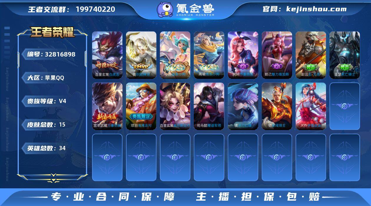 【Ewz565】【低场次高胜率野王小号 镜炽阳神光+百里玄策白虎志带专属按键 秒换绑】苹果Q-V4-至尊星耀III段位-34英雄-15皮肤-2传说-3史诗 【传说皮肤】:镜炽阳神光,百里玄策白虎志 【限定皮肤】:项羽海滩派对,百里玄策白虎志 【年限皮肤】:百里玄策白虎志 【战令限定】:周瑜线条小狗,小乔线条小狗 【史诗皮肤】:周瑜线条小狗,小乔线条小狗,阿轲节奏热浪,妲己魅力维加斯 【其他皮肤】:宫本武藏万象初新,亚瑟死亡骑士,赵云忍炎影,项羽海滩派对,镜冰刃幻境,司马懿魇语军师,百里玄策威尼斯狂欢,铠龙域领主,大乔伊势巫女 【营地ID】:1531293893