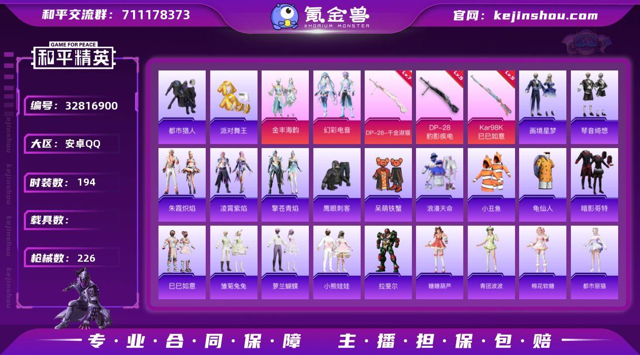 可二次【特价出售/店主推荐】安卓 手Q-2粉装-6特效枪-2粉色飞行器-67590热力值-16王牌印记-194套装-226枪皮【热门品类】:套装-浪漫天命,套装-都市猎人,套装-派对舞王,套装-小丑鱼,套装-龟仙人,套装-暗影哥特【粉色套装】:粉装-金丰海韵,粉装-幻彩电音【粉色枪皮等级】:AKS-74U-森灵之息(五级),Kar98K-巳巳如意(五级),Mk14-福马献瑞(五级),AA12-G-萌骑幻想(三级),DP-28-千金淑猫(七级),DP-28-豹影疾电(五级)【粉色枪皮】:AKS-74U-森灵之息,Kar98K-巳巳如意,Mk14-福马献瑞,AA12-G-萌骑幻想,DP-28-千金淑猫,DP-28-豹影疾电【粉色飞行器】:炫彩糖果飞行器,镜光幻境飞行翼