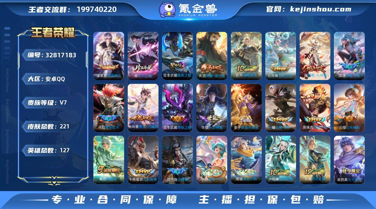 贵族7级,221皮肤,0水晶,1珍品传说,1典藏,15传说,8星元,68史诗,10个性按键,皮肤价值:167536;【典藏】:诸葛亮星域神启;【珍品传说】:暃朽木白哉;【传说】:李信一念神魔,干将莫邪久胜战神,后羿神树通天,马超琥珀纪元,亚连落雪白狼,澜愿照九州拓,关羽神骥镇沧海,墨子黄金天蝎座,孙尚香乘龙问璇玑,云缨幻光神枪,裴擒虎祥瑞亨通,公孙离云诺千山,曜云鹰飞将,桑启鸣野蒿,宫本武藏地狱之眼;【星元】:宫本武藏幽冥之眼,妲己美乐蒂之语,狄仁杰绮世风墨,高渐离炽焰魔法,吕布坚铁战甲,孙尚香时光恋人,安琪拉橙色警戒,亚瑟橙色警戒