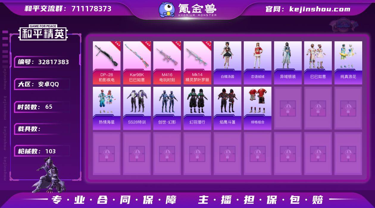 ZMH1367【2粉装-6特 洛天依】安卓手Q-2粉装-6特效枪-65套装-103枪皮-2王牌印记-超级王牌9星-28063热力值【2粉装】角色-洛天依,角色-鸢尾晶梦【6特效枪】M416-电玩时刻[5级],Mk14-精灵梦叶罗丽[7级],Mk14-福马献瑞[5级],DP-28-豹影疾电[5级],Kar98K-巳巳如意[5级],ACE32-萌骑漫游[3级]【4飞行器】马上有福飞行器,狂鲨锋刃飞行器,鸿潮鸣舰飞行器,异域银装飞行器【160其它衣服和枪皮】海岛探路者,巳巳如意,绯格组合,马上有钱,黑色伏地魔,异域银装,角色-摩登魅猫,元气之梦,白糯汤圆,雪国风尚,白色伏地魔,青翼流星,玩偶服-卖崽青蛙,战术大师,焰鹰斗篷,SS28特训,黄色伏地魔,玲珑侠影,青春校园,SS36特训,SS35特训,柠萌假日,SS33特训,角色-银尘,特战装甲,王牌教练,SS29特训,顶瓜瓜,狂鲨锋刃,魅力单车,海盐绵绵冰,角色-时希公主,完美偶像,创世·幻影,漫游都市,角色-冰公主,SS37特训,福马献瑞,龙魂突击队,鹤鸣,蝶变,恋语绒绒,香桃花海,SS34特训,狙击之神,热情海星,纯真浪花,萌鸡速递,SS32特训,冰河战士,龙的传人,角色-白光莹,街头风暴,阳光火鸡,薄荷星砂,角色-情公主,大橘大利,角色-迎夏光舞,幻羽潜行,迅捷龙虾,SS31特训,绮丽涂鸦,角色-幽雨猫猫,UZI-炫彩糖果,SVD-霓彩脉冲,Mk47-虹云熊熊...
