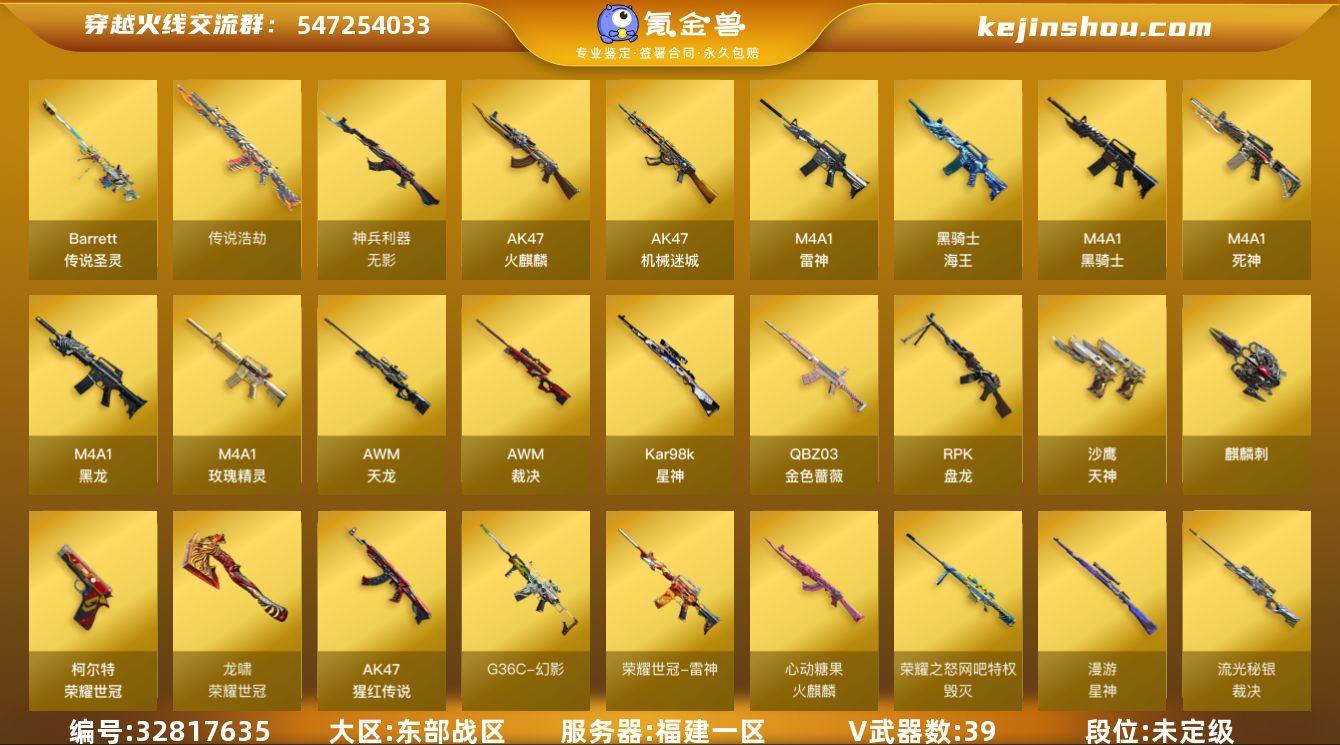 福建一区-47V-2王者武器数-0炫金武器数 【传说武器】:传说浩劫,传说圣灵 【热门武器】:传说圣灵,传说浩劫,G36C-幻影,QBZ03-金色蔷薇,死亡之眼,荣耀世冠-雷神,荣耀世冠-柯尔特,Kar98K-星神,M4A1-黑骑士,RPK-盘龙,羊驼玩偶,荣耀世冠-龙啸 【音效卡】:AWM-裁决音效卡 【皮肤】:QBZ03-冠军之薇,金色蔷薇-电竞之星 皮肤,裁决-流光秘银,星神-漫游,火麒麟-心动糖果,毁灭-荣耀之怒,毁灭-黑大圣皮肤,幻影-缪斯音盒 皮肤,轻型军用手斧-再燃火线,麒麟刺-甜蜜糖果 皮肤 【角色】:葵,樱,研,葵-阿尔法武装,幻面灵狐,暗夜-X,北极狐-X,风暴女,嘉年华灵狐,娟娟,兰-海滩派对,灵狐者-X,灵狐者-黄金海岸,麻雀,曼陀罗-X,潘多拉-X,潜龙队-X,青霞仙子,斯沃特-X,蜀雪,铁骑荣耀,新娜塔莎,雪莉杨,影武者-X 【人偶武器】:柯尔特-雪球投手,USP-铃狮送福,AWM-灵狐-15周年嘉年华,M37-葵,迷你深渊冰龙,迷你裂空之翼*2,迷你生化手雷,生化手雷-机甲核心,深渊终结者手雷,巴雷特-赏金猎人,迷你艾比,迷你巨石泰坦-魔花研究所,灵狐娃娃手雷 【暴走生化】:死亡之眼,超级对讲机 【挑战大师】:VEPR-12-金魔,激光毁灭者III,机甲撕裂者III,阐释者II...