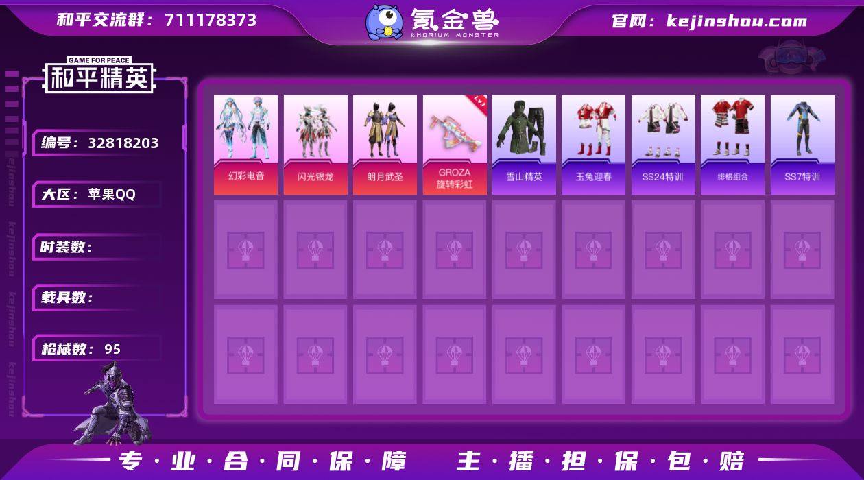 WJ864【可二次】苹果手Q-3粉装-1特效枪-66套装-95枪皮-3王牌印记-不朽星钻Ⅲ-25687热力值【3粉装】闪光银龙,幻彩电音,朗月武圣【1特效枪】GROZA-旋转彩虹[7级]【3稀有】AKM-奇异狩猎者,汤姆逊-奇异狩猎者,S686-奇异狩猎者【1飞行器】光之冒险尾迹【1头盔】甜心宝贝头盔【154其它衣服和枪皮】绯格组合,红色运动,老实芭蕉,甜心亚梦,玉兔迎春,覆海蛟龙,SS36特训,SS32特训,霓虹街区,沙漠毒蛇,冰川特警,探宝勇士,幻世战舞者,SS37特训,SS23特训,SS2特训,湖蓝色名流,SS24特训,麻辣教官,琉璃情波,SS7特训,战地菁英,虚音幻奏,SS19特训,飞驰魅影,甜蜜告白,都市魅力,音速流光,娇憨猪猪,黄色伏地魔,牛气满满,完美偶像,SS20特训,黑色伏地魔,狙击之神,SS34特训,熠彩粉晶,竞技名士,田园牧歌,都市漫游者,轻风白浪,长空猛禽,SS5特训,SS22特训,SS33特训,白色伏地魔,竞技勇士朋克,蓝色运动,灼焰舞者,荧惑魅影,雪山精英,光之冒险,骑行爱好者,疯狂小兔子,SS21特训,SS6特训,海滨突袭者,魅力单车,北国孤狼,军械专家,坚韧舞者,雪国风尚,萌趣咩咩,DP-28-彩虹符号,P90-飞驰魅影,MG-36-薄荷星砂,MG3-瑞龙福将,UZI-幻影飞狐,Vector-彩虹符号,M762-幻影飞狐,M249-月影鸳鸯,S12K-童趣迷兔,S1897-炫彩节奏,蜜獾...