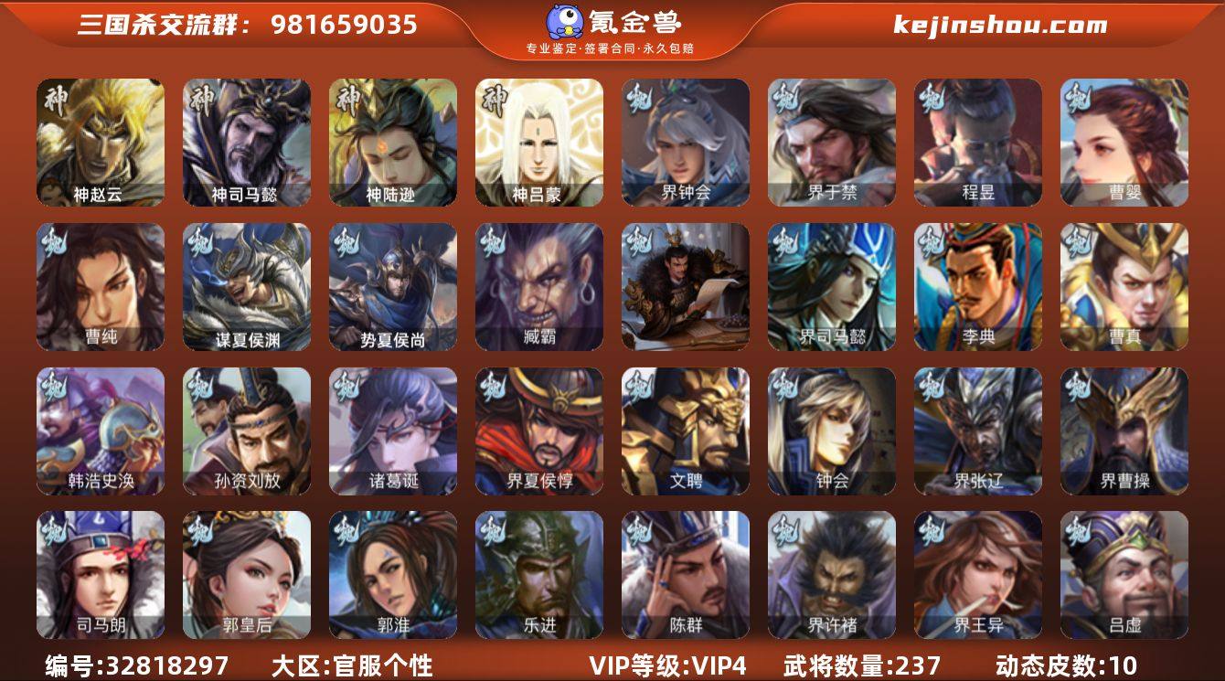 官阶:骠骑将军;VIP等级:VIP4;史诗武将数量:16;动态皮肤数量:10;武将总数:237;史诗宝珠数量:0;将魂数量:392;神将:3;魏国史诗武将:4;蜀国史诗武将:3;吴国史诗武将:3;群史诗武将:2