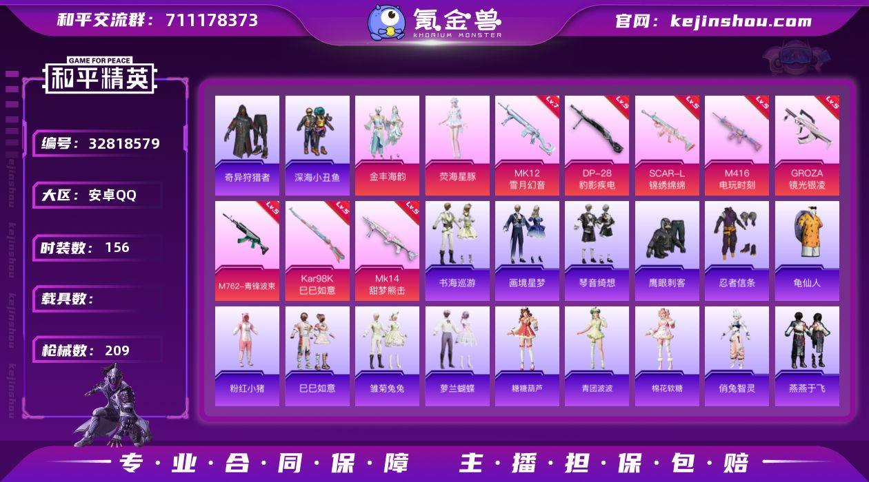 实名: 可修改 时装数: 156 枪械数: 209 战备数: 164 热门装扮: 奇异狩猎者,深海小丑鱼,鹰眼刺客,金丰海韵,荧海星豚 稀有枪皮: SCAR-L-锦绣绵绵,M416电玩时刻,M762-青锋波束,GROZA-镜光银凌,Kar98K-巳巳如意,MK12-雪月幻音,MK14-甜梦熊击,DP-28-豹影疾电 亮点: 安卓 手Q-2粉装-11特效枪-0载具-3粉色飞行器-62654热力值-13王牌印记-156套装-209枪皮【热门品类】:套装-深海小丑鱼,套装-奇异狩猎者,套装-忍者信条,套装-龟仙人,套装-粉红小猪【粉色套装】:粉装-金丰海韵,角色-荧海星豚【粉色枪皮等级】:SCAR-L-锦绣绵绵(五级),M416-电玩时刻(五级),GROZA-镜光银凌(五级),M762-青锋波束(五级),AKS-74U-森灵之息(五级),Kar98K-巳巳如意(五级),Mk14-甜梦熊击(五级),Mk14-福马献瑞(五级),MK12-雪月幻音(七级),AA12-G-萌骑幻想(三级),DP-28-豹影疾电(五级)【粉色枪皮】:SCAR-L-锦绣绵绵,M416-电玩时刻,GROZA-镜光银凌,M762-青锋波束,AKS-74U-森灵之息,Kar98K-巳巳如意,Mk14-甜梦熊击,Mk14-福马献瑞,MK12-雪月幻音,AA12-G-萌骑幻想,DP-28-豹影疾电【粉色飞行器】:炫彩糖果飞行器,萌物绒绒飞行器,极意拳锋飞行器【粉色降落伞】:橘柚倾心降落伞,垂柳戏鸭...