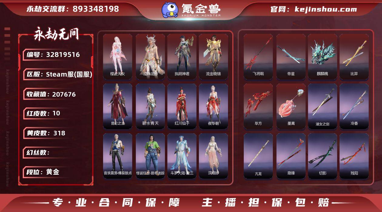 有红皮斩马刀,金皮劫涛潮,阔刀金皮雷王锯 飞刀翠影,横刀全红以及4把金皮,扇有4把金皮 每一把武器最少一把金皮,弓箭有毕方,胡桃有樱云天女以及三个金皮,水娘有泣珠龙纱,以及三件金皮,魏青有执明神君以及两款金皮,狐狸有三个金皮,其他英雄最少一款金皮,钩锁红皮也有