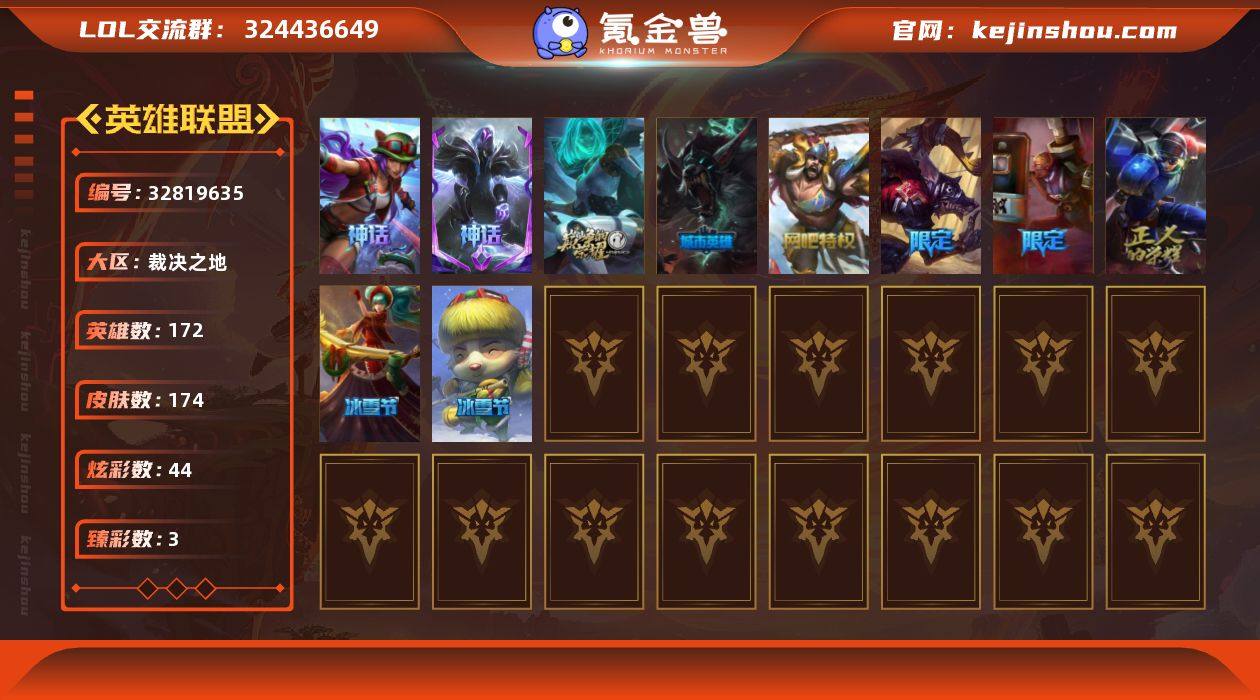 t38397【裁决之地】174皮肤 44炫彩 3臻彩 5神话/16限定/14传说/172英雄 账号等级:427【重要皮肤】灰烬骑士派克 胜利行刑官德莱文 胜利剑圣易 胜利机器人布里茨 胜利枪神卢锡安 胜利之剑亚托克斯 平安夜女神娑娜 防暴士兵辛吉德 防暴天使凯尔 鬼影重重魔腾 圣诞开心鬼提莫 圣诞玩偶波比 野兽猎人泰达米尔 暗影沃里克 都铎王朝图奇 十五周年纪念希维尔 十周年纪念安妮 源代码乐芙兰 神凰行者瑞羽圣凰艾尼维亚 【传说皮肤】冰霜亚龙希瓦娜 冰川巨兽墨菲特 灌篮高手德莱厄斯 陆地王者4WD布里茨 苍穹之光韦鲁斯 霸天异形卡兹克 女皇艾希 战地机甲厄加特 战场女武神凯尔 未来战士凯特琳 神王盖伦 第三类接触黑默丁格 偶像歌手阿狸 女校长菲奥娜 【重要炫彩】冠军之志瑞兹凯旋圣装 光明骑士奎因诡秘守望者 霸天异形卡兹克黄金异端