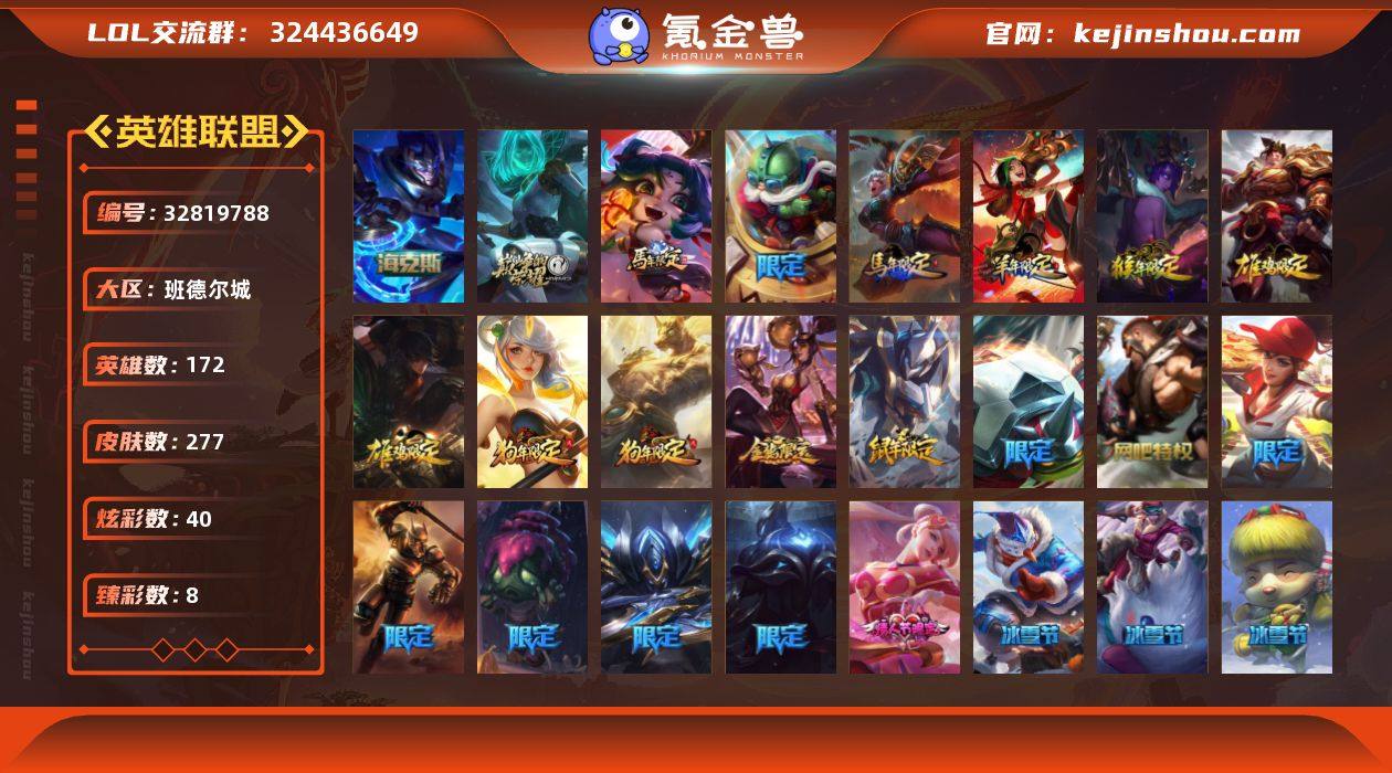 t38490【班德尔城】277皮肤 40炫彩 8臻彩 3神话/40限定/26传说/172英雄 账号等级:497 【重要头像】心型钥匙 【重要皮肤】海克斯科技嘉文四世 胜利女神娑娜 电玩女神厄运小姐 替父从军花木兰 神龙烈焰金克丝 春晖神女拉克丝 北辰之威内瑟斯 紫金罗刹莫甘娜 虎痴之拳蔚 张辽文远 烈焰美人薇恩 龙马烈焰波比 甜心宝贝娑娜 持胡萝卜的雪人易 狂心冰王图奇 魄罗骑士瑟庄妮 死亡誓约劫 泳池派对李青 泳池派对布隆 送披萨的小姐姐希维尔 制胜金球拉莫斯 SKTT1阿利斯塔 SSW图奇 SSW辛吉德 SKTT1贾克斯 SKTT1李青 SKTT1薇恩 暗杀星慎 冠军掠夺者卡兹克 冠军之隐劫 鬼影森森茂凯 惊悚派对阿木木 警用试作体K9内瑟斯 南瓜头费德提克 圣诞开心鬼提莫 外星装甲库奇 邪恶圣诞老人维迦 雪默丁格 野兽猎人德莱文 十周年纪念安妮 源代码乐芙兰 机神苍狼瑟提 暗裔英雄盖伦 【传说皮肤】焰尾妖狐阿狸 神王德莱厄斯 上古战魂魔腾 日蚀骑士蕾欧娜 战场女武神凯尔 神拳李青 真实伤害艾克 绅士科加斯 枯萎之壤泽拉斯 银河魔装机神兰博 丧尸布兰德 红色男爵库奇 铁哥们儿奥拉夫 驯龙炮手崔丝塔娜 欧米伽小队幽灵特工 霸天异形卡兹克 恶...