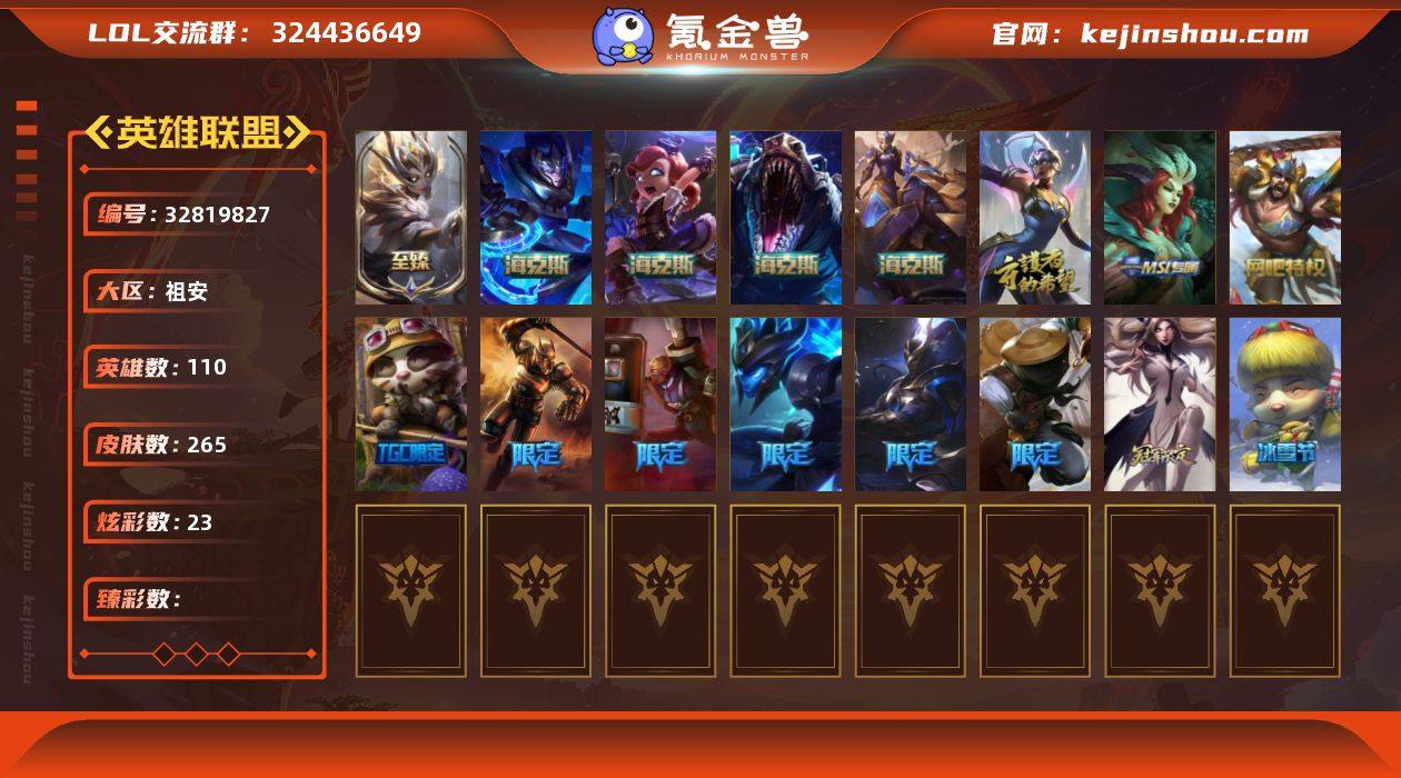 t38417【祖安】265皮肤 23炫彩 8神话/21限定/29传说/110英雄 账号等级:162 云顶神话:3【重要头像】不错哦 至臻魔女婕拉 【重要皮肤】魔女婕拉至臻 海克斯科技安妮 海克斯科技瑟庄妮 海克斯科技雷克顿 海克斯科技嘉文四世 黎明使者卡尔玛 养蜂人辛吉德 胜利枪神卢锡安 魅惑女巫莫甘娜 穿星魔锋赵信 iG艾瑞莉娅 SKTT1奥拉夫 Fnatic库奇 Fnatic古拉加斯 防暴士兵辛吉德 冠军之矛卡莉丝塔 警用试作体K9内瑟斯 密林猎手提莫 南瓜头费德提克 圣诞精灵崔丝塔娜 圣诞开心鬼提莫 圣诞玩偶波比 圣诞驯鹿克格莫 无头骑士赫卡里姆 野兽猎人泰达米尔 永恒之森乐芙兰 阿木木主人不要我了 十周年纪念安妮 神凰行者瑞羽圣凰艾尼维亚 【传说皮肤】电玩女神娑娜 符文战熊沃利贝尔 女校长菲奥娜 枯萎之壤泽拉斯 星之守护者阿狸 黯黑魔龙希瓦娜 战斗学院伊泽瑞尔 宇航员诺提勒斯 焰尾妖狐阿狸 炼狱魔犬内瑟斯 女警狙击凯特琳 日蚀骑士蕾欧娜 源计划净化薇恩 未来战士凯特琳 合金巨兽努努和威朗普 红色男爵库奇 律政大亨蒙多 双重冰晶艾尼维亚 冰霜之刃艾瑞莉娅 女皇艾希 大天使长米迦勒凯尔 战地巨兽科加斯 战地机甲厄加特 提莫约德尔人的...