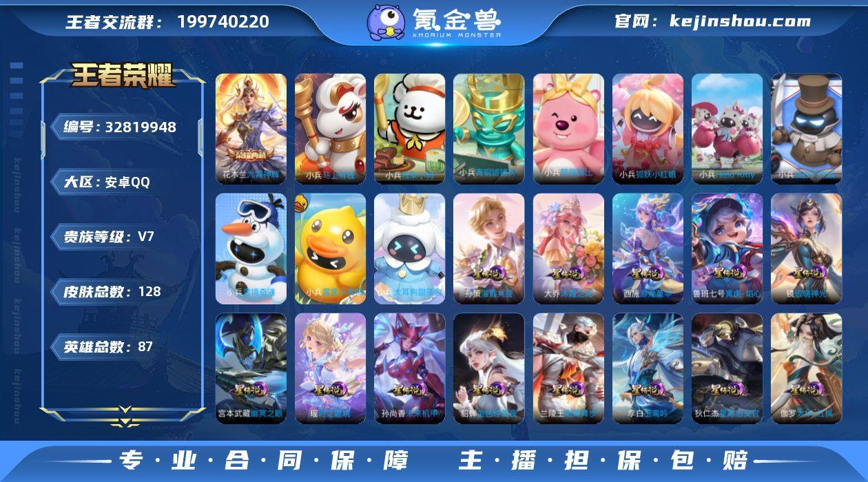 贵族等级:VIP8 卖家说:QQ半靓号 王者荣耀:两颗荣耀水晶没使用,有木兰典藏,露娜全皮,对抗路首选,司空震蛇限,关羽马限,马超神威,公孙离机甲皮,鲁班电玩,项羽苍穹之光,10000+紫星币,皮肤碎片300+ 金铲铲之战:至臻龙女以及5位限定小小英雄,攻击特效有金剑